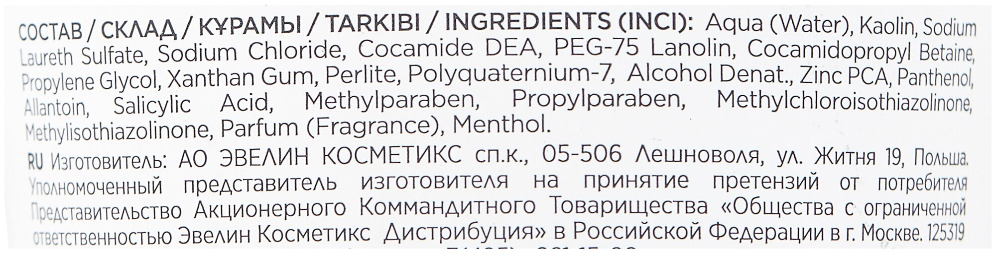 | Состав | aqua (water), kaolin, sodium laureth sulfate, sodium chloride, cocamide dea, peg-75 lanolin, cocamidopropyl betaine, propylene glycol, xanthan gum, perlite, polyquaternium-7, alcohol denat., zinc pca, panthenol, allantoin, salicylic acid, methylparaben, propylparaben, methylchloroisothiazolinone, methylisothiazolinone, parfum (fragrance), menthol |