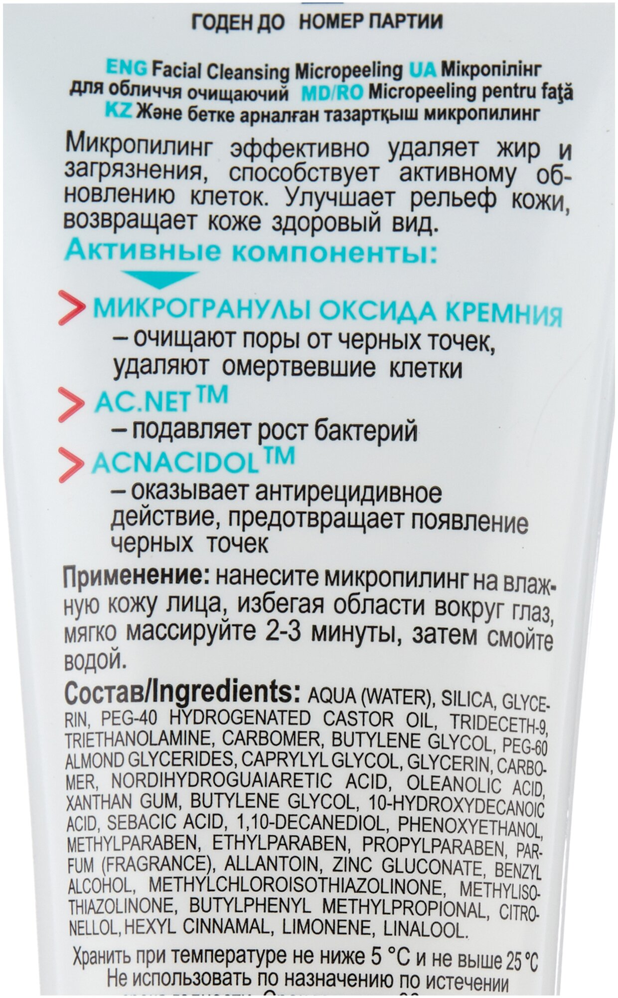 | Способ применения | Нанесите микропилинг на влажную кожу лица, избегая область глаз, мягко массируйте 2-3 минуты, затем смойте водой. Применять 1-2 раза в неделю. |