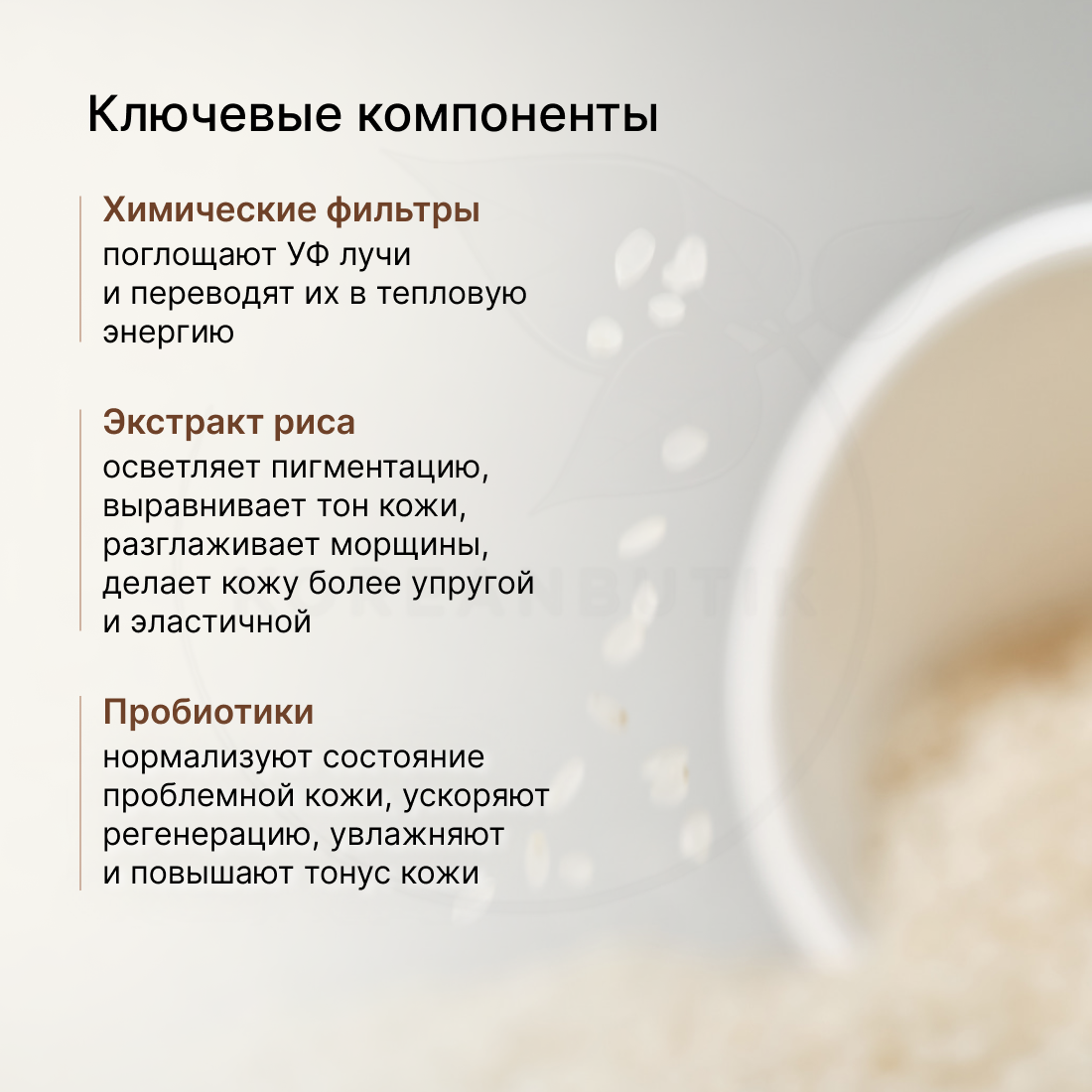 | Активные ингредиенты | аденозин, лактобактерии, ниацинамид, пребиотики, пробиотики, протеины риса |