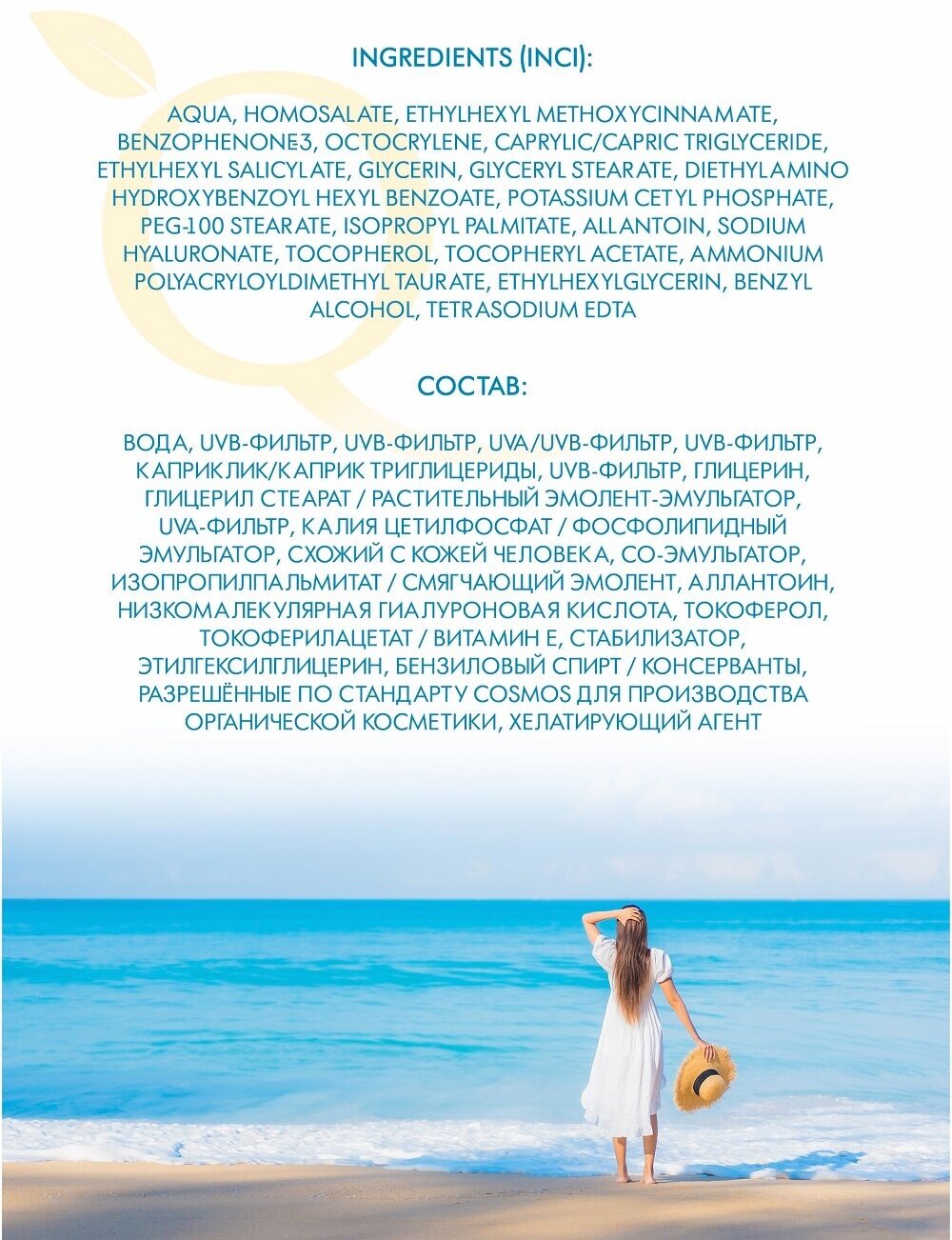 | Состав | Aqua (Вода), Homosalate (UVB-фильтр), Ethylhexyl Methoxycinnamate (UVB-фильтр), Benzophenone-3 (UVA/UVB-фильтр), Octocrylene (UVB-фильтр), Caprylic/Capric Triglyceride (Каприклик/каприк триглицериды), Ethylhexyl Salicylate (UVB-фильтр), Glycerin (Глицерин), Glyceryl Stearate (Глицерил стеарат / растительный эмолент-эмульгатор), Diethylamino Hydroxybenzoyl Hexyl Benzoate (UVA-фильтр), Potassium Cetyl Phosphate (Калия цетилфосфат / Фосфолипидный эмульгатор, схожий с кожей человека), PEG-100 Stearate (со-эмульгатор), Isopropyl Palmitate (Изопропилпальмитат / смягчающий эмолент), Allantoin (Аллантоин), Sodium Hyaluronate (Низкомалекулярная гиалуроновая кислота), Tocopherol, Tocopheryl Acetate (Токоферол, токоферилацетат / Витамин Е), Ammonium Polyacryloyldimethyl Taurate (Стабилизатор), Ethylhexylglycerin, Benzyl Alcohol (Этилгексилглицерин, Бензиловый спирт / консерванты, разрешённые по стандарту COSMOS для производства органической косметики), Tetrasodium EDTA (Хелатирующий агент) |