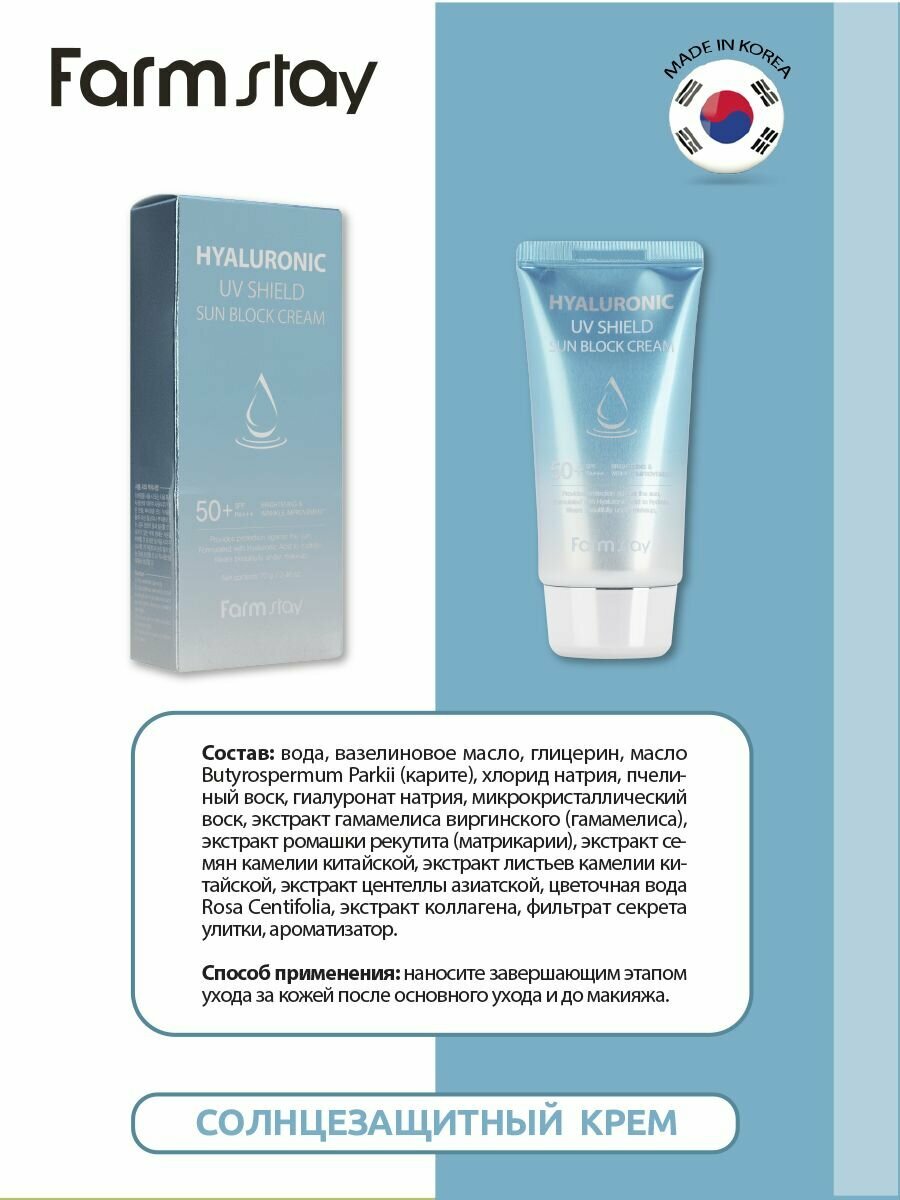 | Дополнительная информация | формула Hyaluronic UV Shield Sun Block Cream SPF50+ PA+++ содержит: - гиалуроновую кислоту — повышает упругость кожи, интенсивно увлажняет ее, подтягивает контур лица |