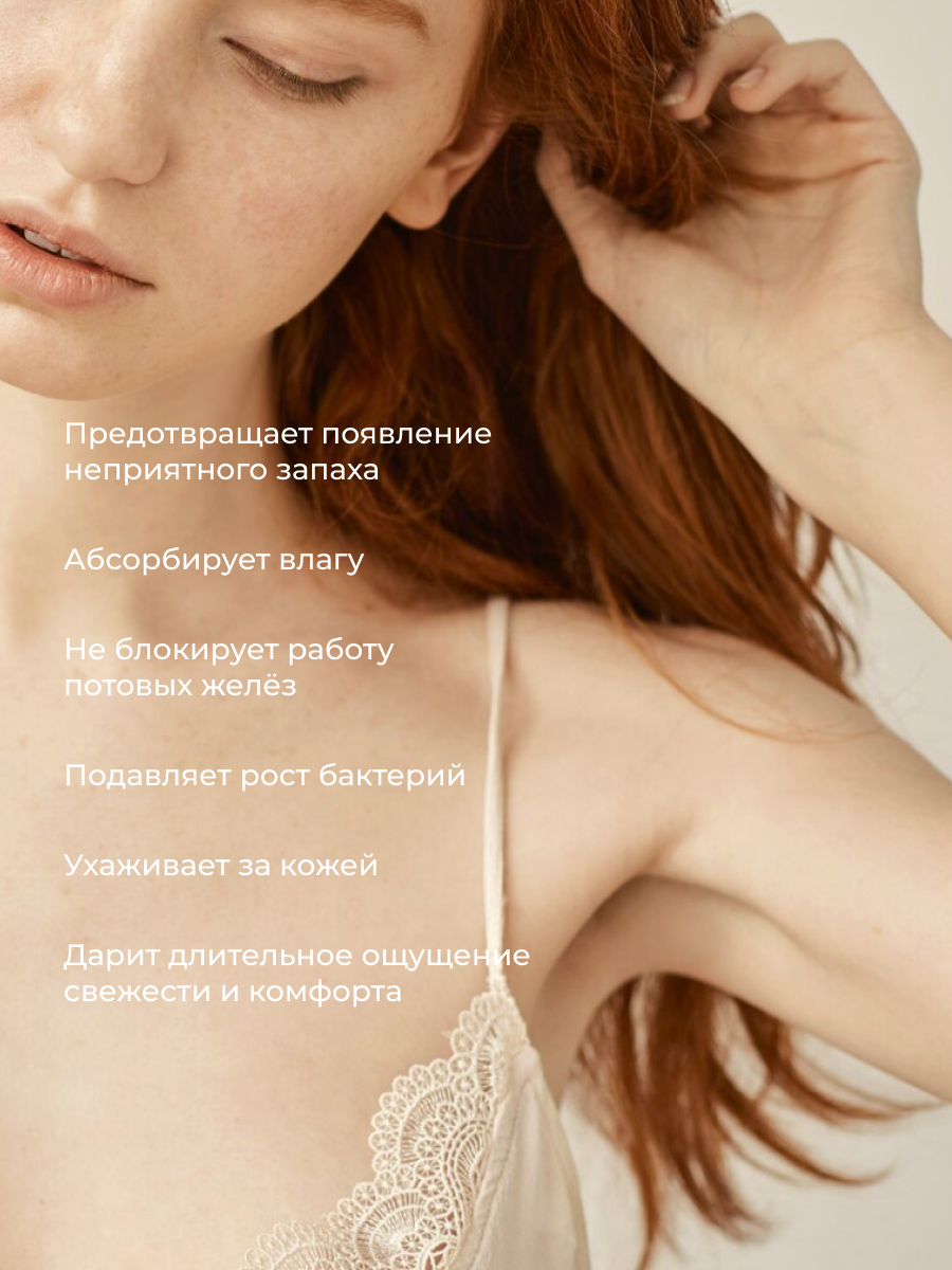 Дополнительная информация | Натуральные ингредиенты, безопасный состав, не блокирует работу потовых желез, ухаживает за кожей |