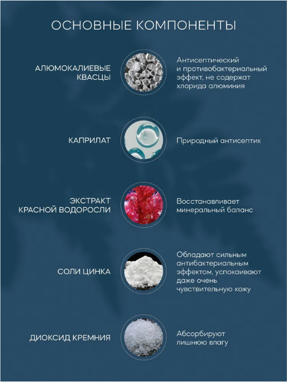 | Полный состав | Aqua (Вода), Lavandula Angustifolia Flower Water (Гидролат лаванды), Potassium Alum (Алюмокалиевые квасцы), Glycerin (Глицерин), Glyceryl Caprylate (Растительный эмолент), Silica (Минеральный сорбент), Propylene Glycol (Кондиционирующий агент натурального происхождния), Zn PCA (Компонент НУФ), Betaine (Бетаин), Lavandula Angustifolia Oil (Эфирное масло лаванды), Corn Starch (Кукурузный крахмал), Sodium Bicarbonate (Сода пищевая), Menthyl Lactate (Охлаждающий агент), Xanthan Gum (Ксантановая камедь), Tocopherol (and) Beta-Sitosterol (and) Squalene (Антиоксиданты). |