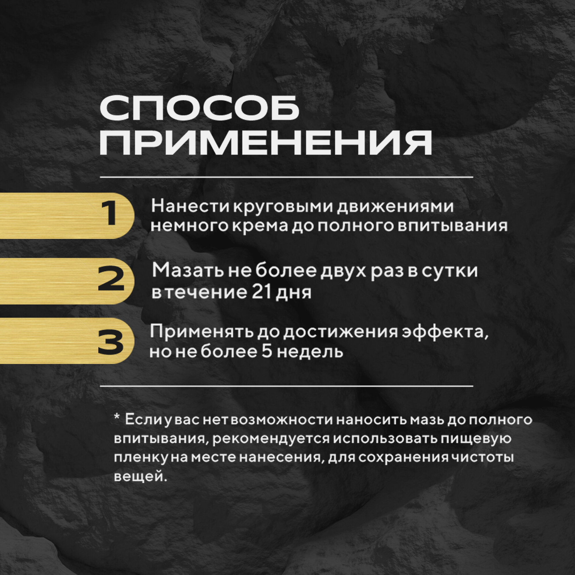 | Способ применения | Для использования мази следует наносить ее тонким слоем на проблемные участки кожи после их очищения (промывания водой) два раза в день на 30–40 мин. Если Вы нанесли крем не до полного впитывания, то после указанного времени протереть остаток мази смоченной в растительном масле ватой, после чего промыть нафталановым мылом в теплой воде. ВНИМАНИЕ! ЕСЛИ У ВАС НЕТ ВОЗМОЖНОСТИ НАНОСИТЬ МАЗЬ ДО ПОЛНОГО ВПИТЫВАНИЯ, РЕКОМЕНДУЕТСЯ ИСПОЛЬЗОВАТЬ ПИЩЕВУЮ ПЛЕНКУ ИЛИ ДРУГИЕ ЗАЩИТНЫЕ СРЕДСТВА ДЛЯ СОХРАНЕНИЯ ЧИСТОТЫ ВАШИХ ВЕЩЕЙ |
