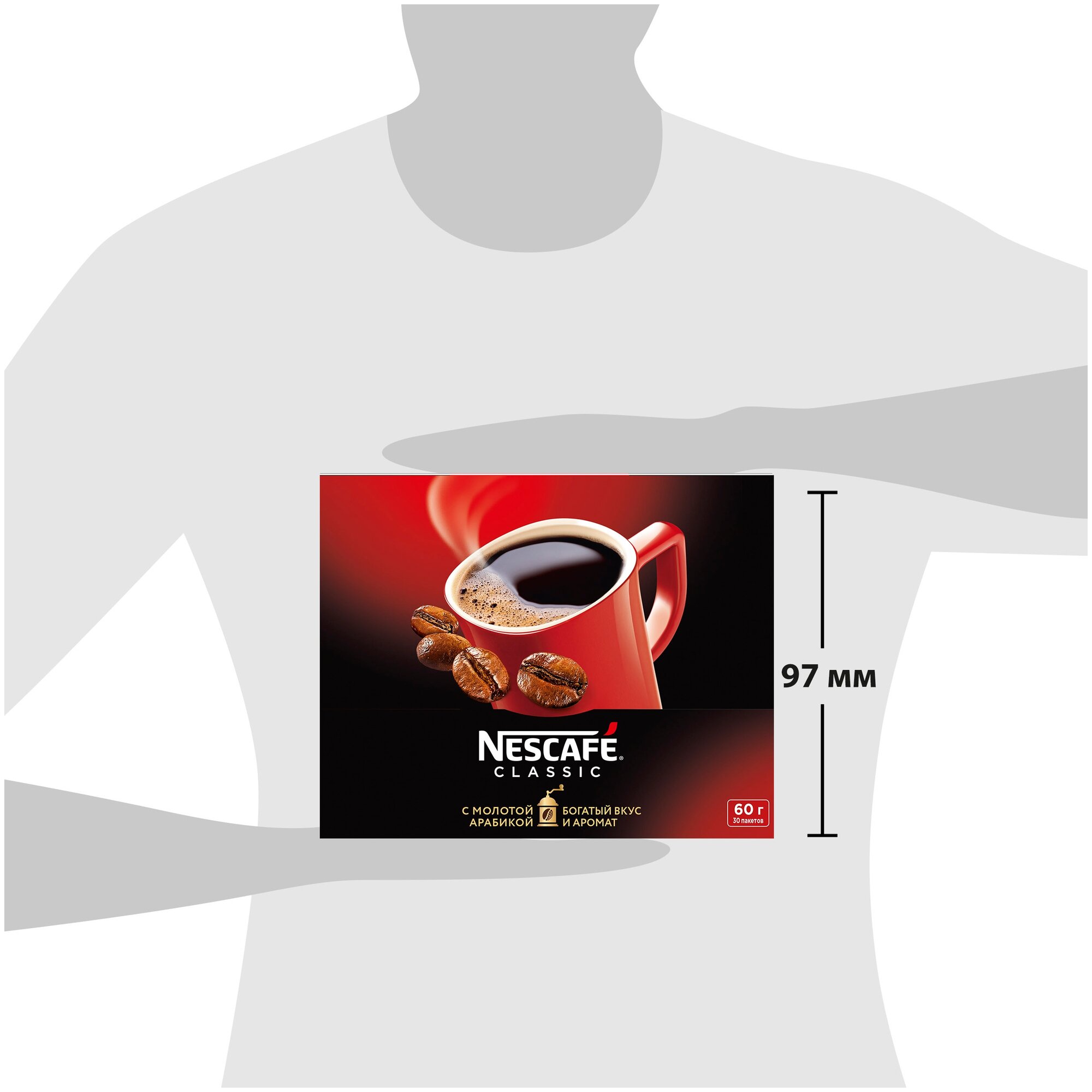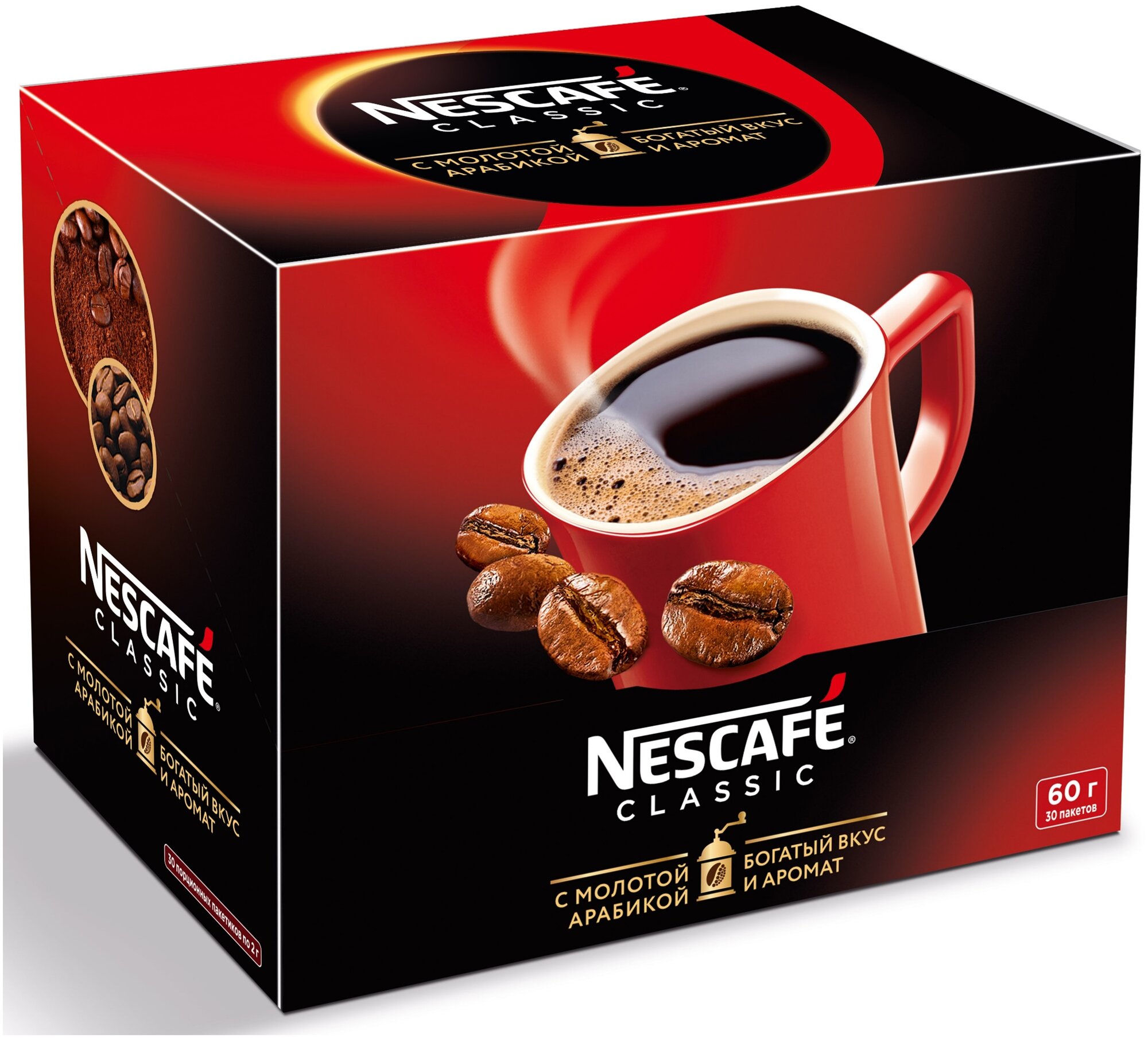 NESCAFÉ® CLASSIC, 100% натуральный растворимый порошкообразный кофе с добавлением натурального жареного молотого кофе, 30 шт. по 2г, шоубокс