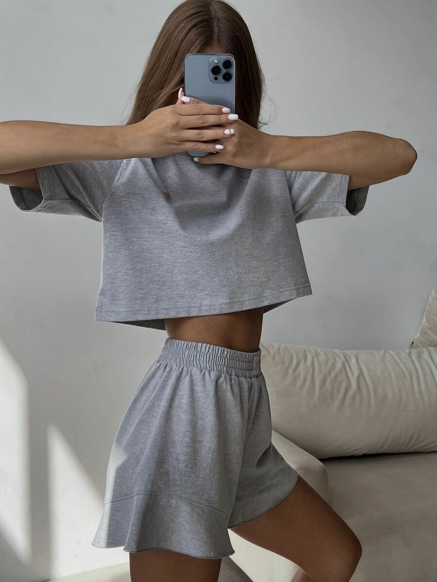 Женская пижама с шортами и футболкой из хлопка размер xs-s серый меланж 2 800 ₽