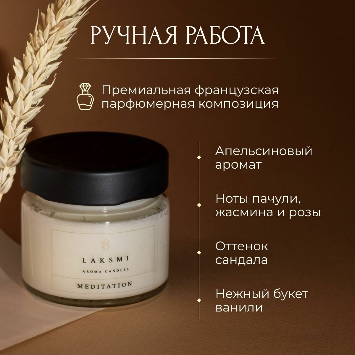 Свеча ароматическая "Медитация" Аромасвеча Laksmi/ деревянный фитиль с эффектом "потрескивания"/ 25 ч. горения, 100мл информация: