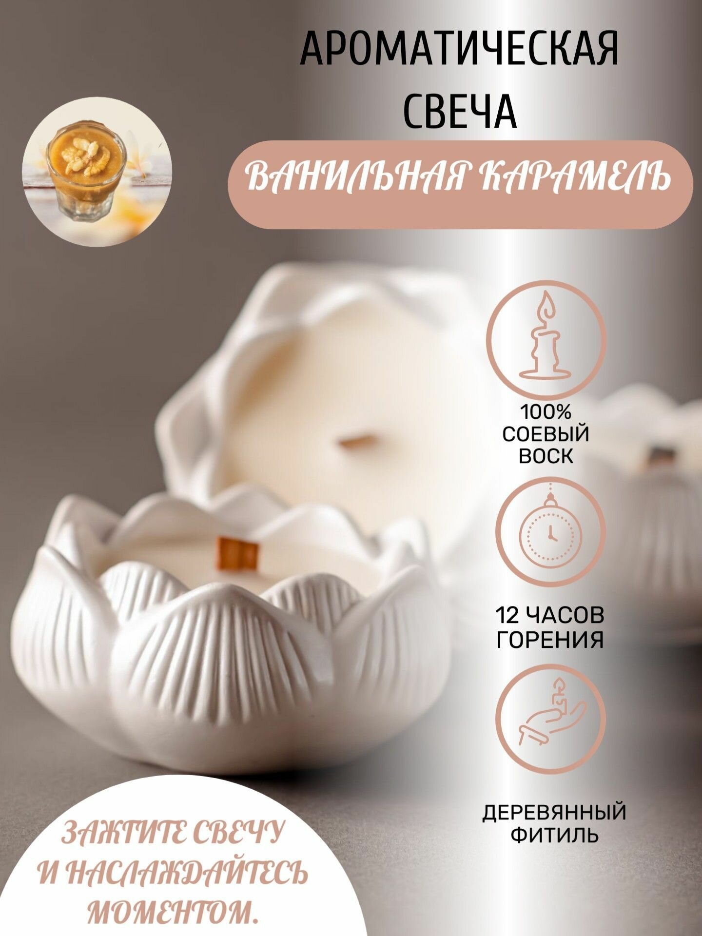 Свечи ароматические ванильная карамель/ Аромасвеча из соевого воска в форме лотоса /Аромасвечка с деревянным фитилем / 15ч горения / Ручная работа информация: