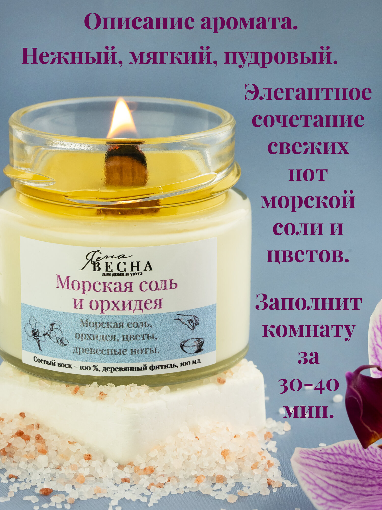 Свеча ароматическая для дома с ароматом морская соль и орхидея в банке, объем 100 мл, двойной деревянный фитиль, соевый воск. информация: