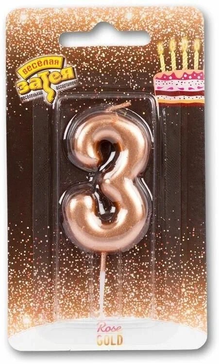 Свечи для торта, Весёлая затея, Свеча-цифра 3 розовое золото