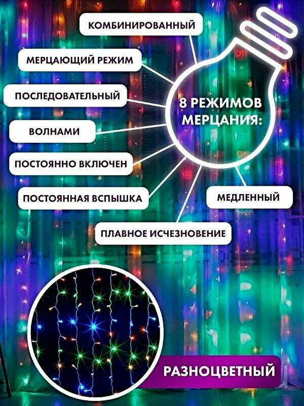Гирлянда штора "Светодиодный Дождь", гирлянда занавес на окно светодиодная, 1.5 x 1.5 разноцветная цвет теплый информация: