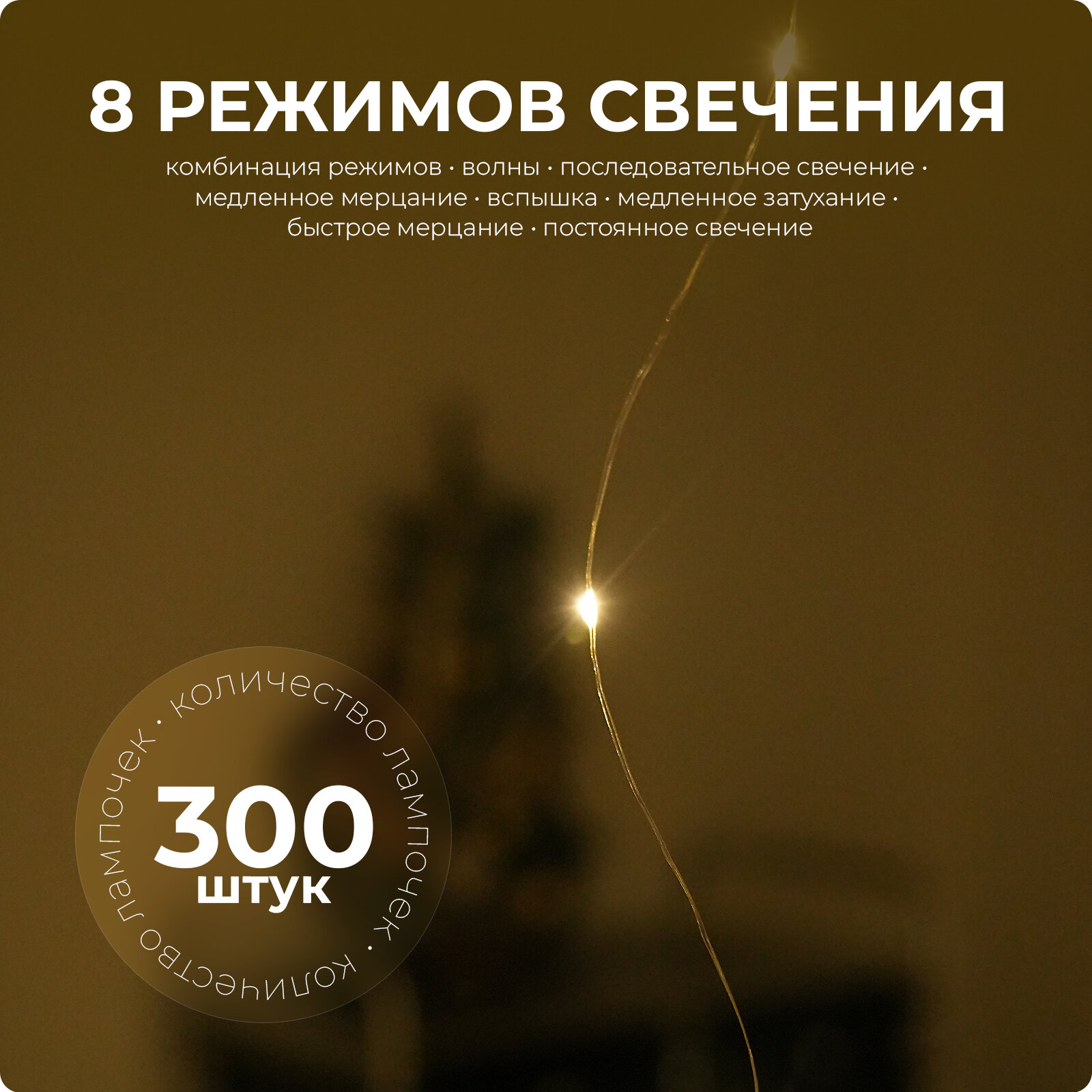 Гирлянда «Нить» 7 м, IP20, тёмная нить, 180 ламп, свечение тёплое белое, 8 режимов, 220 В, 187157
