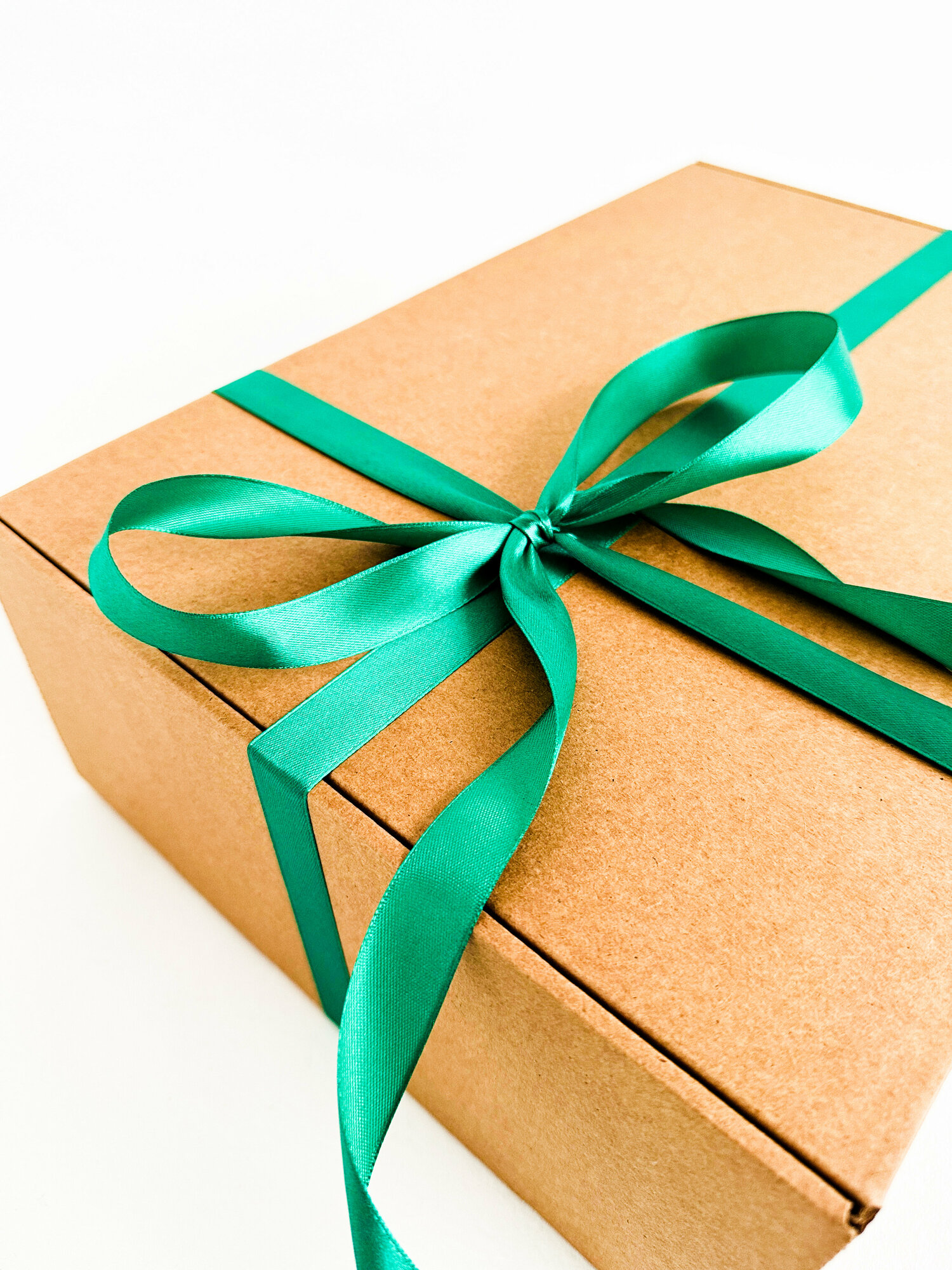 Подарочная коробка GILEV 32x22x10см с наполнителем и зеленой лентой информация: