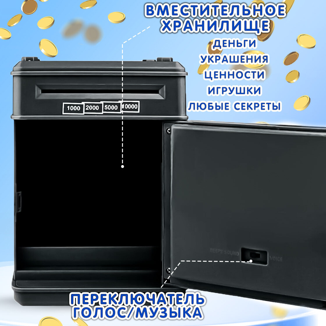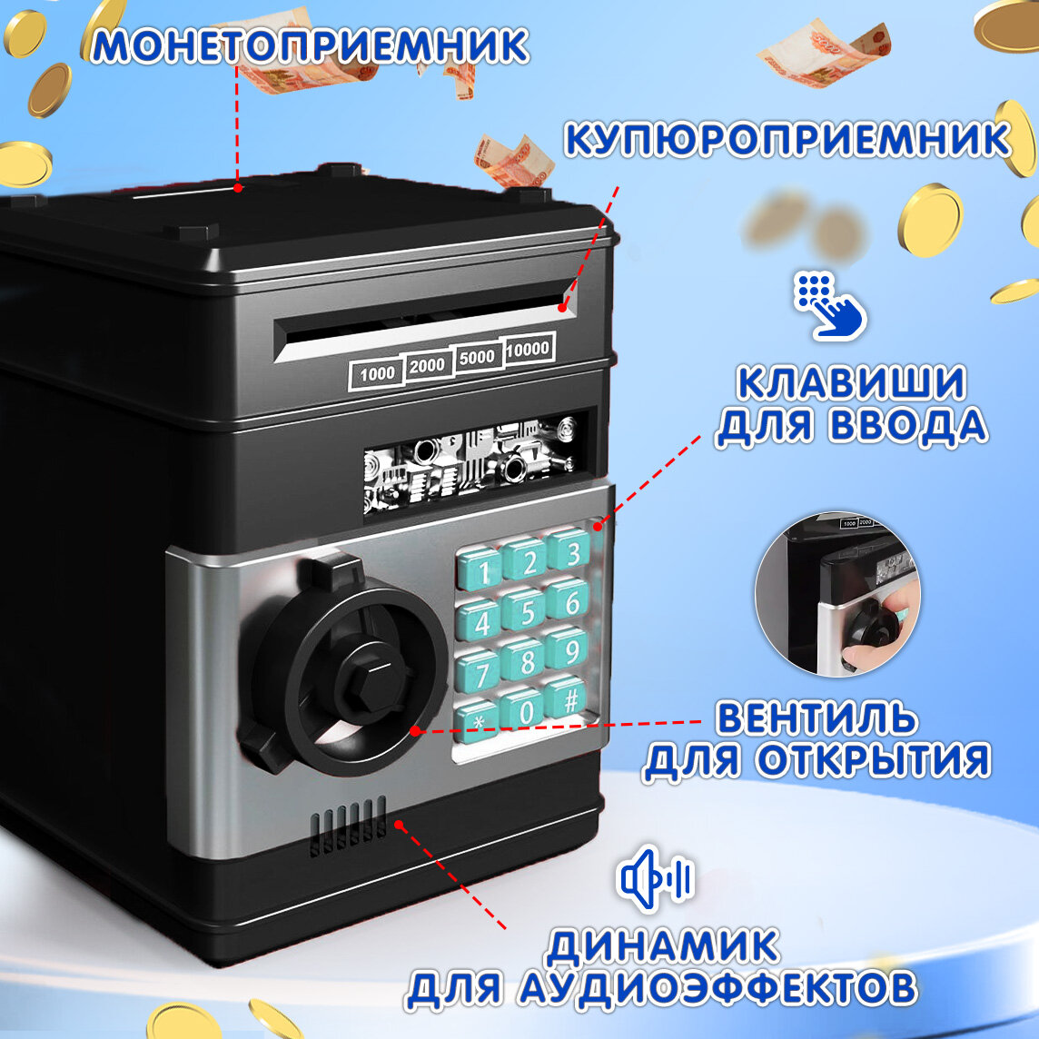 10 цен на Копилка Сейф пластиковая эврика, детская, для монет и купюр, мелочей, денег, подарочная (черный) 23 февраля, 8 марта