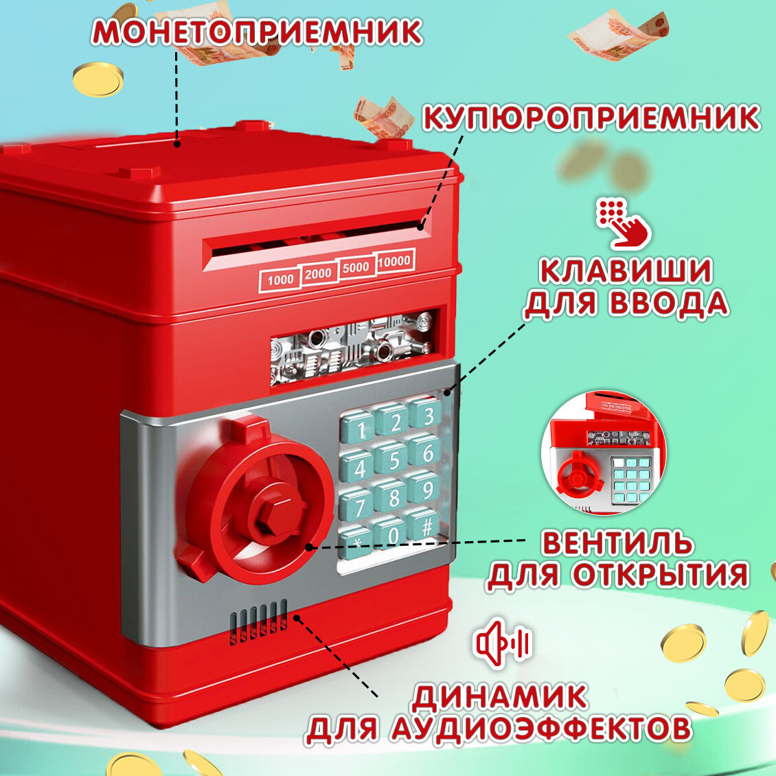 10 цен на Копилка Сейф пластиковая эврика, детская, для монет и купюр, мелочей, денег, подарочная (красный) 23 февраля, 8 марта