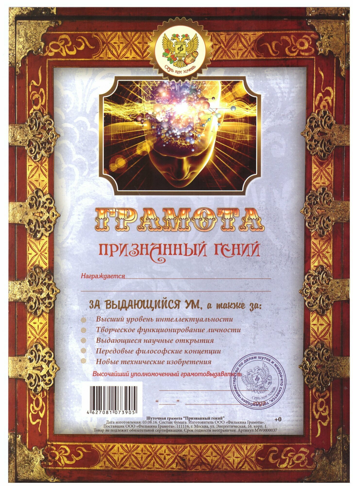 Грамота открытка поздравительная Признанный гений ,А4 информация: