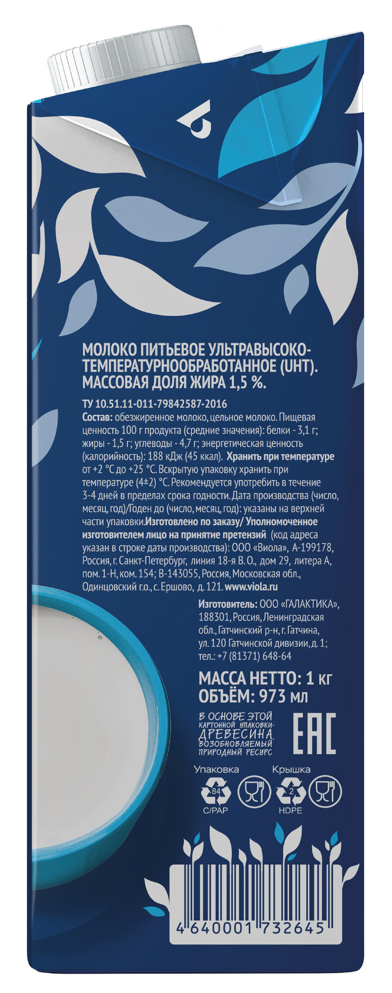 Молоко питьевое ультравысокотемпературнообработанное (UHT). Массовая доля жира 1,5%, 1 кг информация: