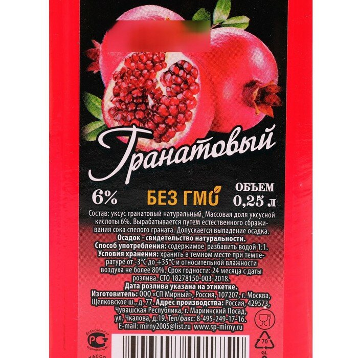 Уксус гранатовый натуральный, 6 %, 250 мл информация: