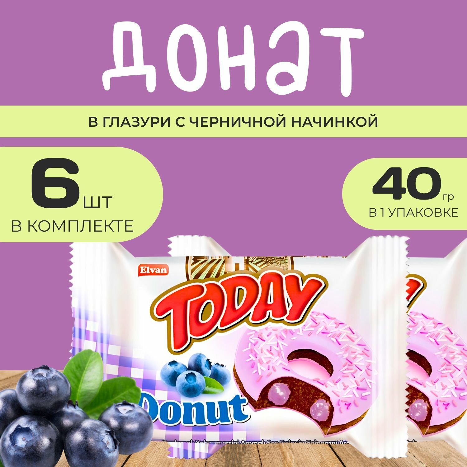 10 цен на Today Донат с черничной начинкой 6 шт. х 40 гр. Пончик "Черничный" в индивидуальной упаковке