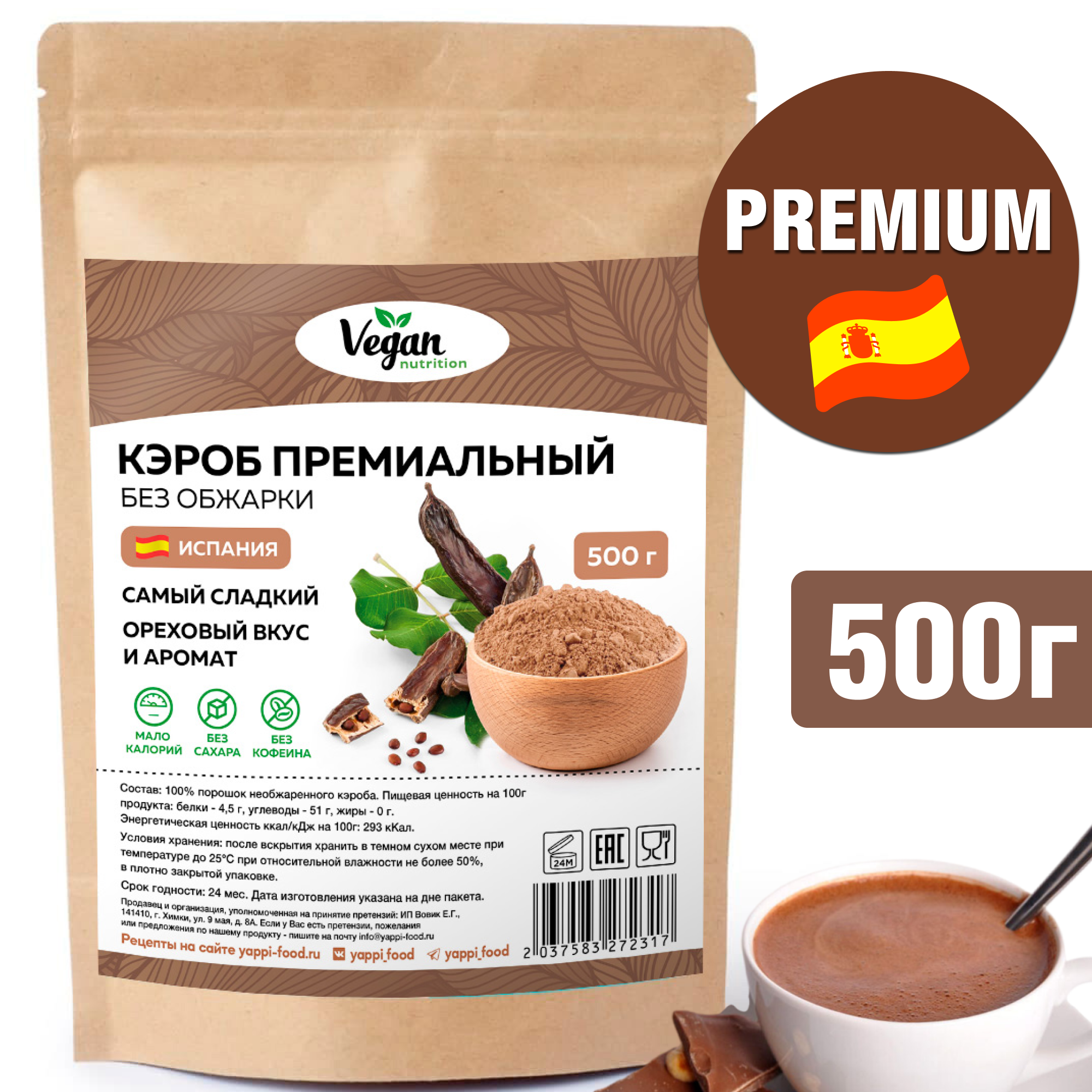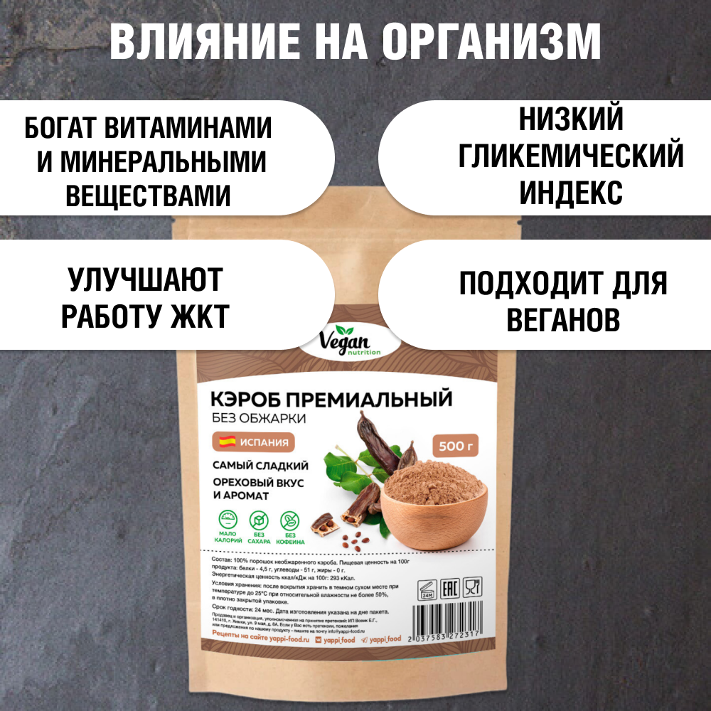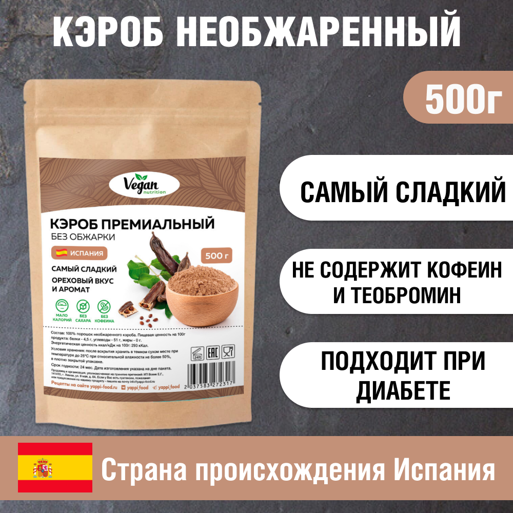 Кэроб Vegan Nutrition необжаренный для какао и шоколада без сахара 500г информация: