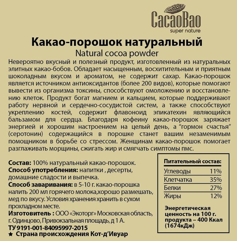 Какао-порошок натуральный КакаоБао (CacaoBao) КОТ-Д'ИВУАР, 100 гр информация: