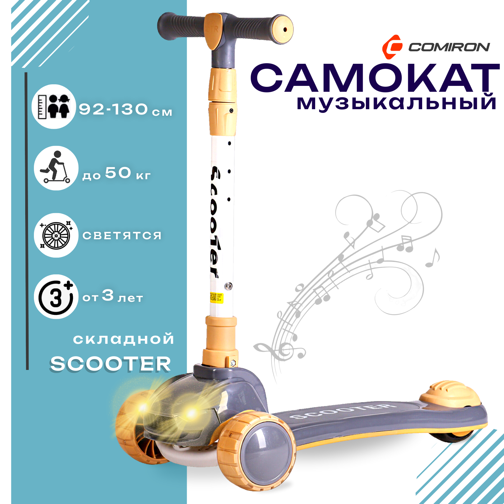 Отзывы на Самокат с фарами и музыкой трехколесный SCOOTER, складная ручка, светящиеся PU колеса 110 и 80 мм., до 50 кг., ABEC 7, серый / 1 шт.