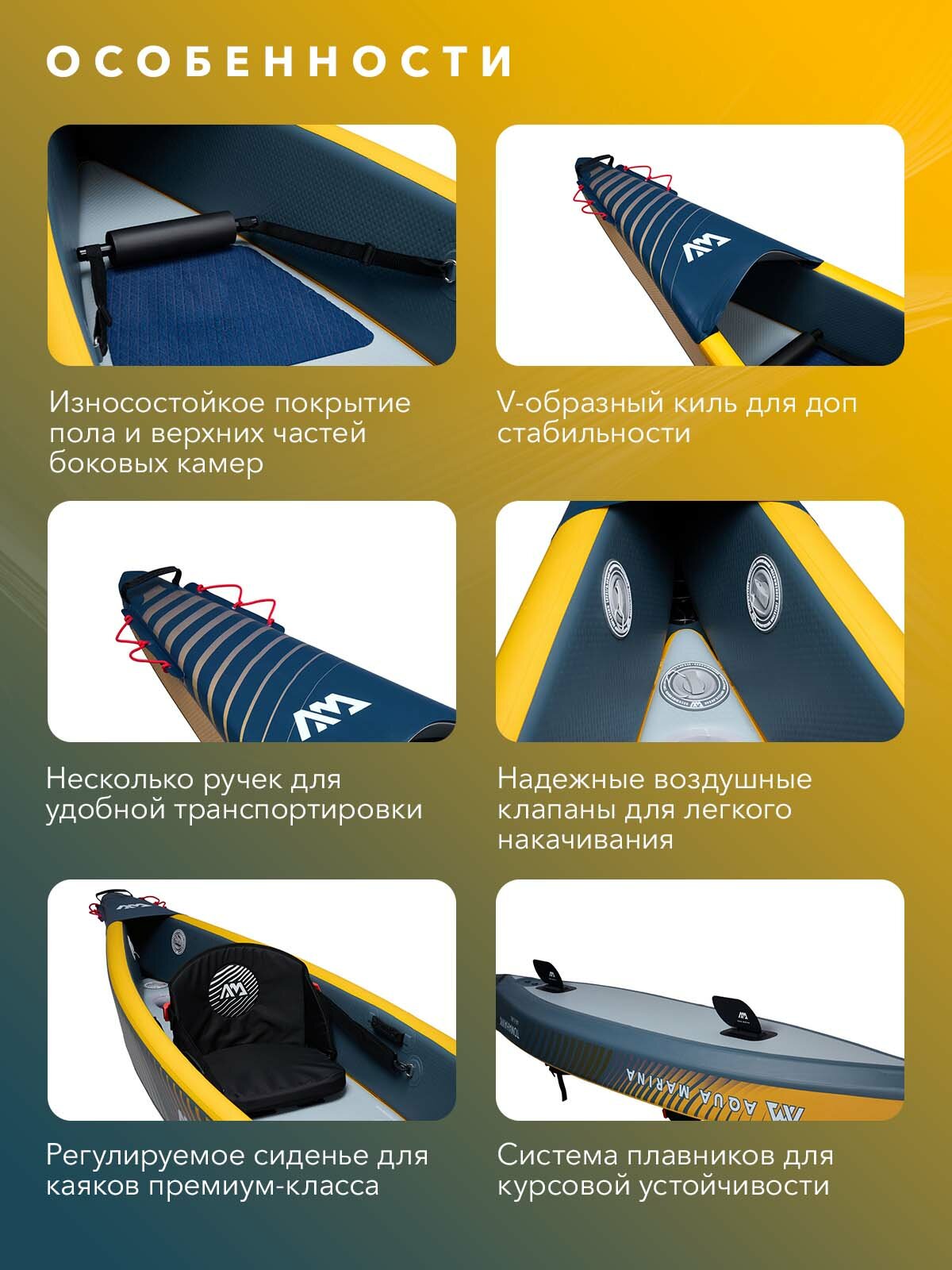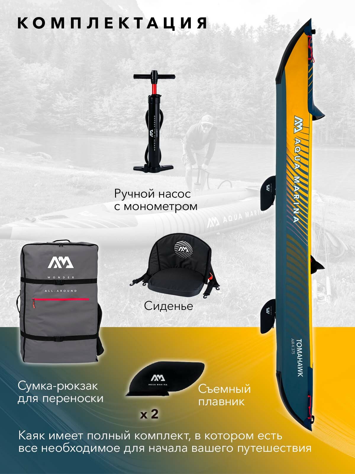 10 цен на Каяк надувной одноместный без весел Aqua Marina Tomahawk AIR-K 375 размеры 375x72 см, макс 128 кг, в комплекте рюкзак, насос, плавник (AIR-K 375)