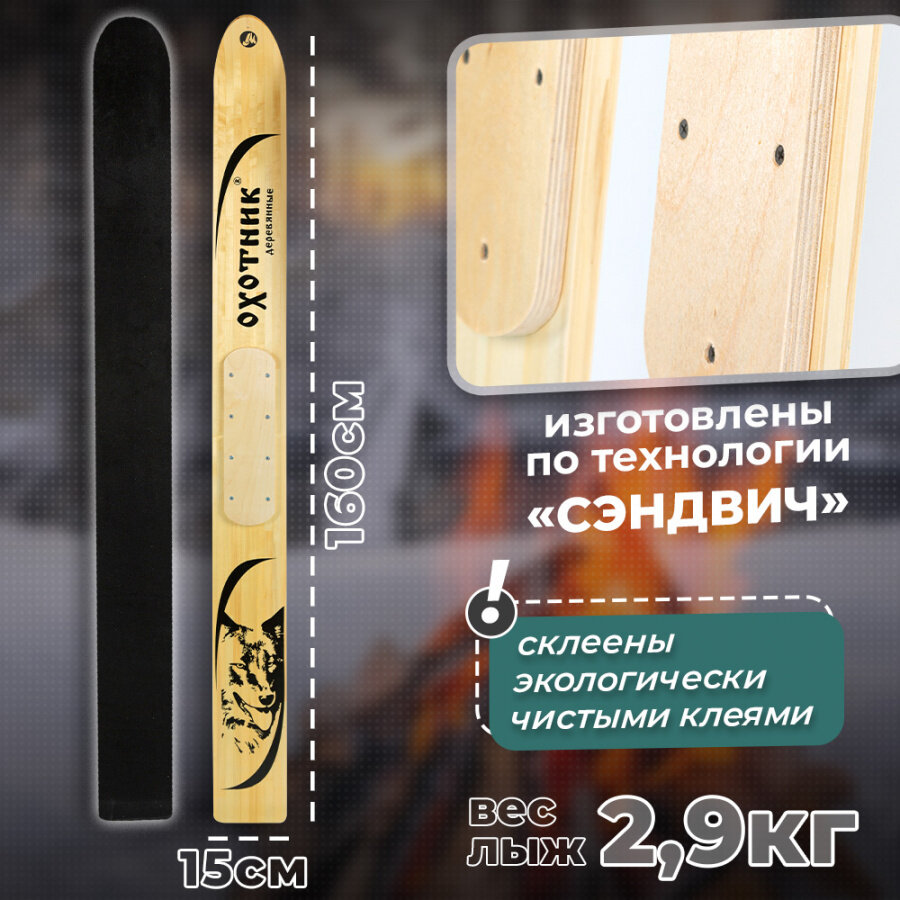 Лыжи охотничьи деревянные Маяк Охотник 160 х 15 см с камусом полное покрытие и накладками информация:
