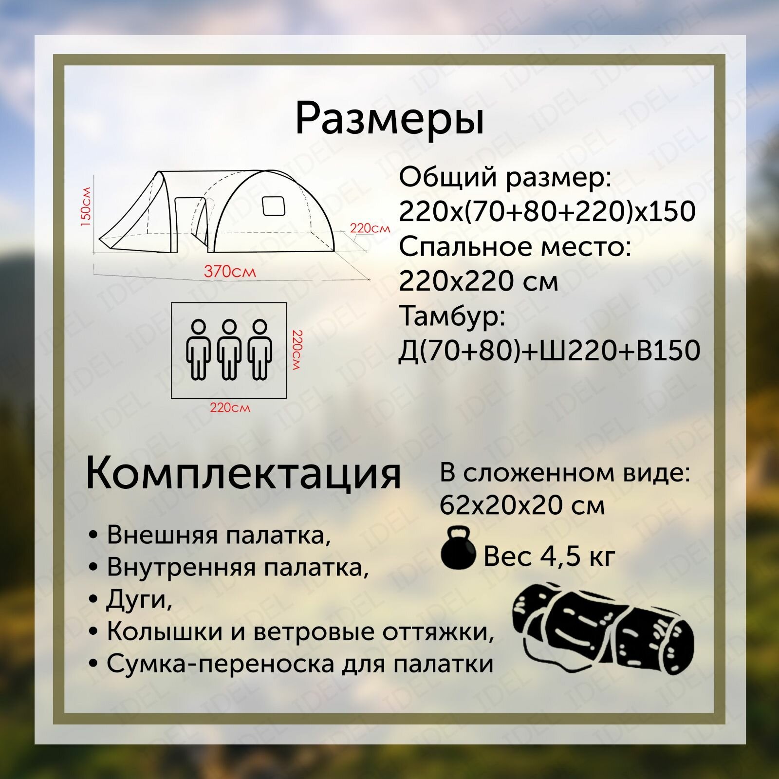 | Габариты внешней палатки(ДxШxВ) | 370x220x150 cм |
