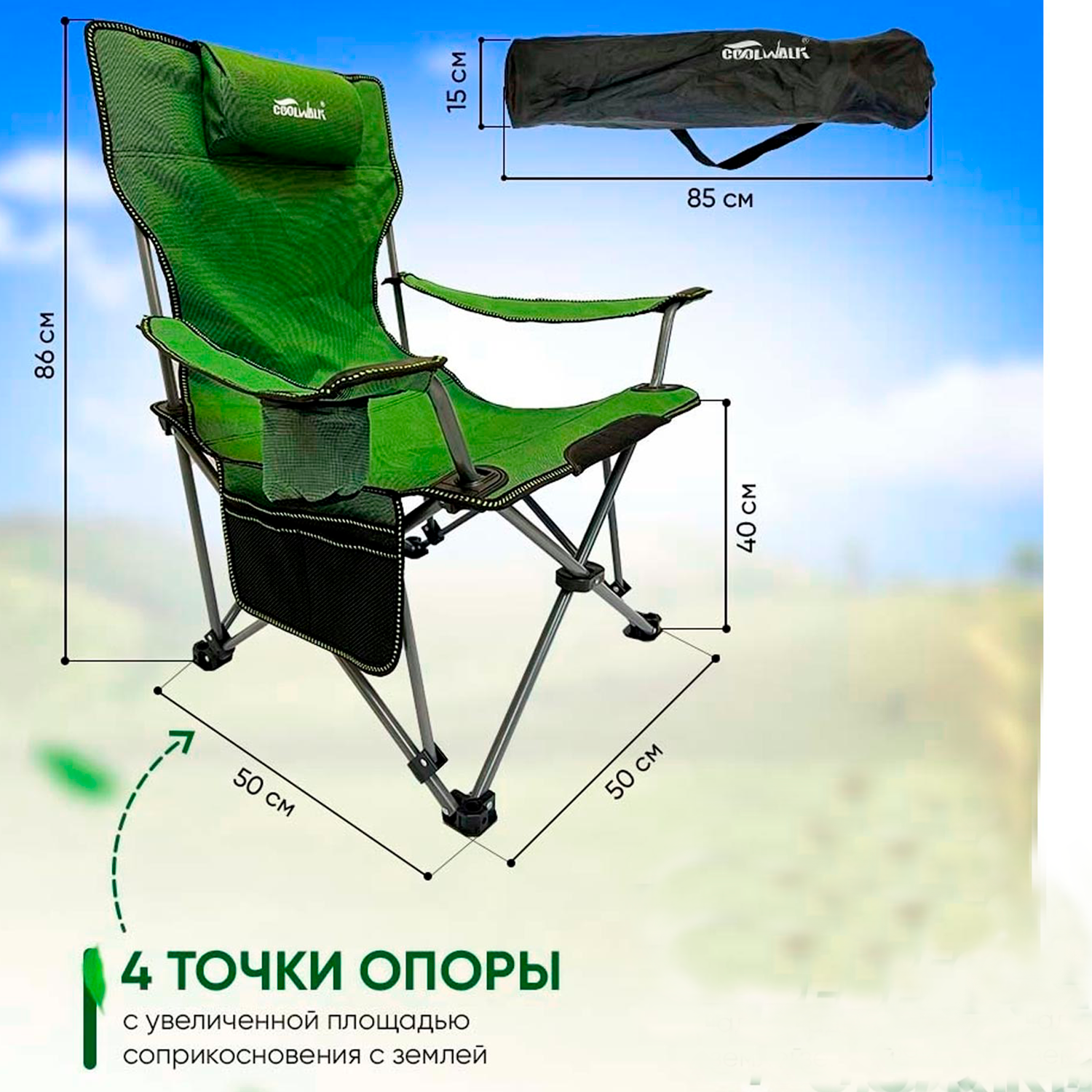 Карповое складное кресло усиленное с подлокотниками COOLWALK в чехле 56х60х93 , зеленое