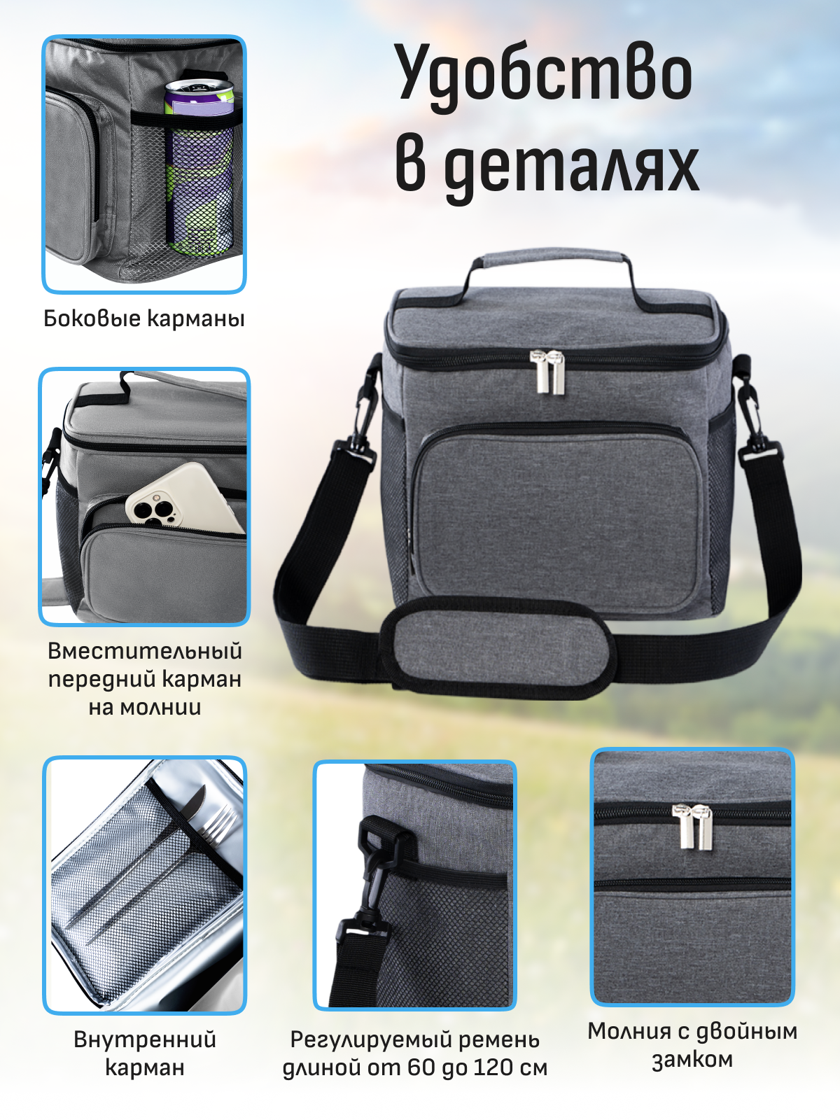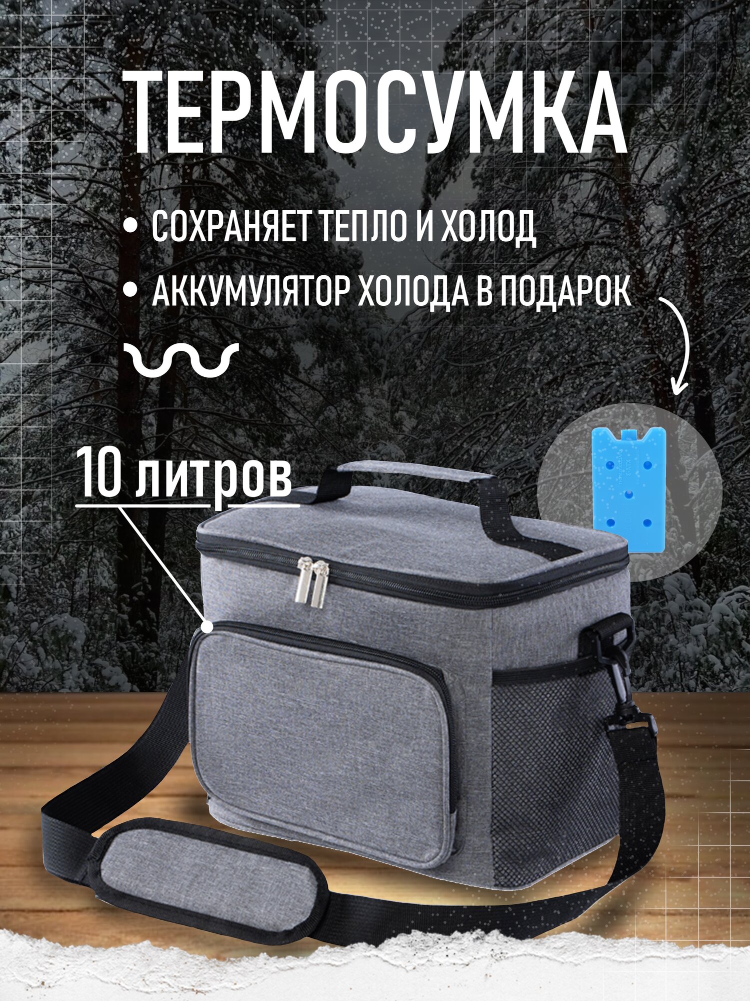 Термосумка холодильник для продуктов и напитков / для ланча (пикника), объем 10 литров, серый + аккумулятор холода информация:
