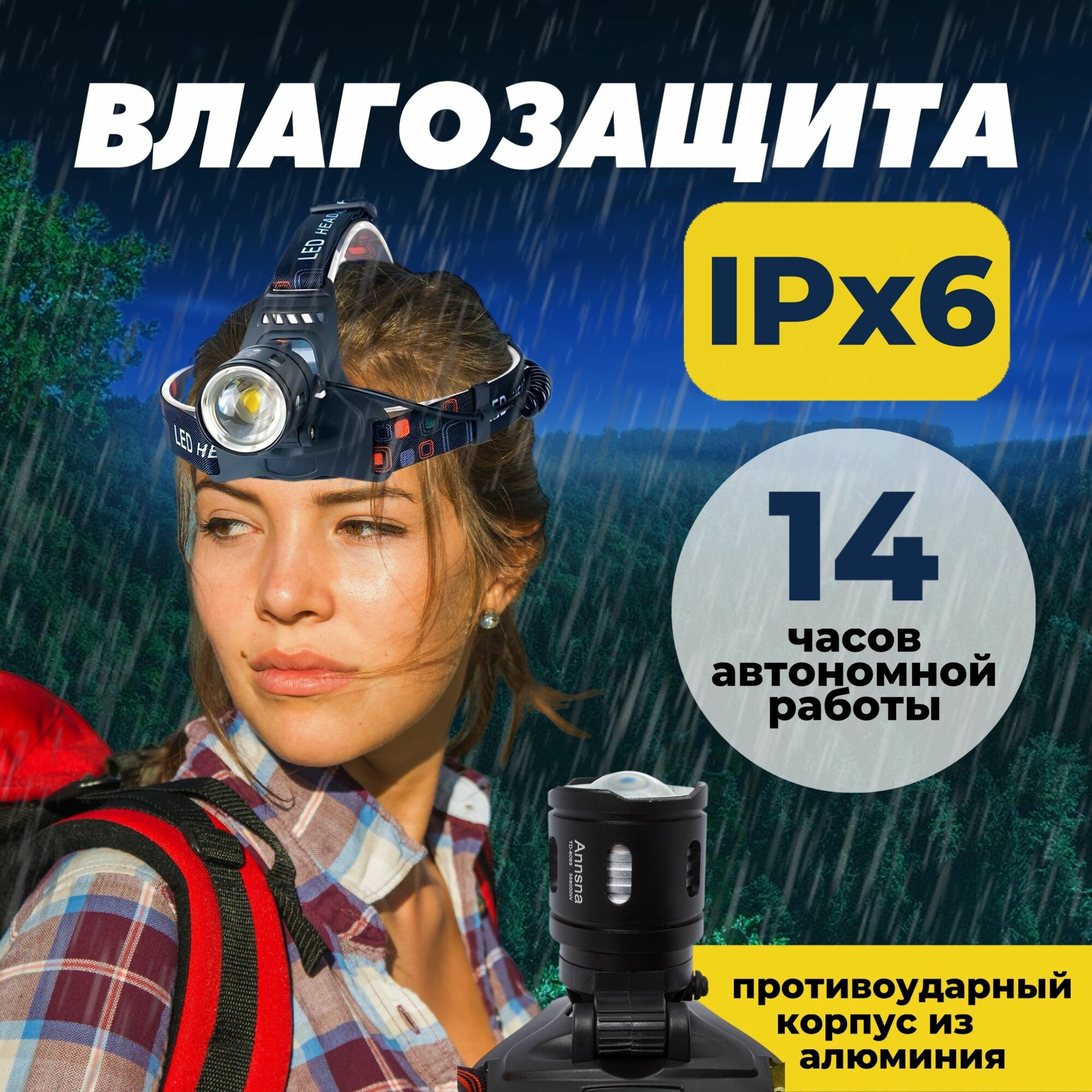 Налобный фонарь аккумуляторный, мощный светодиодный 18650