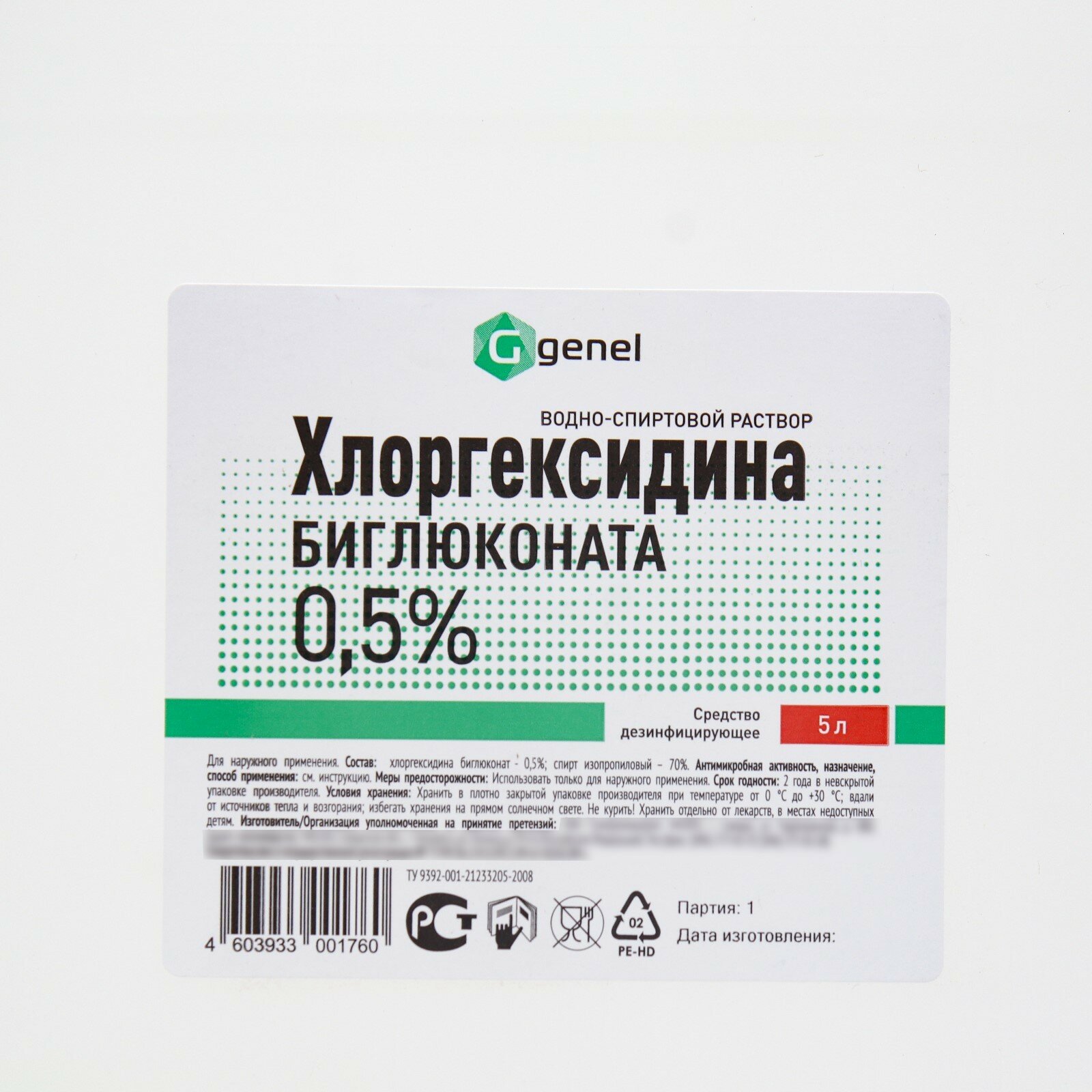Средство дезинфицирующее Хлоргексидин спиртовой 0,5%, канистра, 5 л, Самарамедпром, 608302 информация: