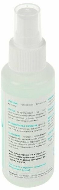 | Особые указания | средство используют только для наружного применения; кожный антисептик нельзя наносить на слизистые оболочки, следует избегать попадания средства в глаза; смывание рабочих растворов средства с поверхностей, не контактирующих с пищей, не требуется; после обработки не требуется проветривания помещения; обработку можно проводить без средств индивидуальной защиты органов дыхания, в присутствии людей; средство легко воспламеняется! нельзя допускать контакт средства с открытым пламенем, включенными нагревательными приборами; по истечении срока годности использование средства запрещается |