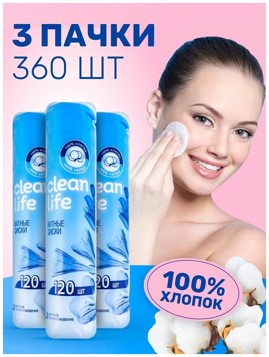 10 цен на Clean Life Ватные диски, Гипоаллергенные, Мягкие, Косметические, хлопок 100%, 360 штук