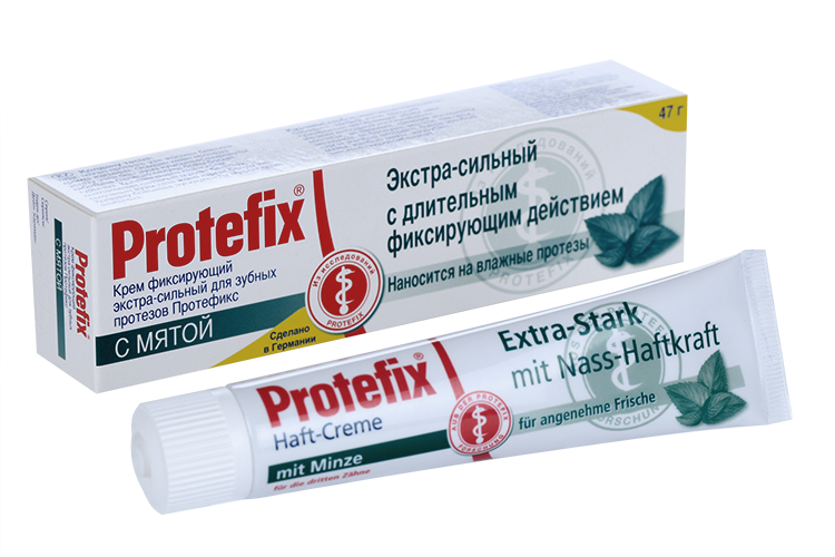 | Способ применения | Протезы и полость рта очистить от остатков пищи. На влажные протезы нанести тонкой прерывистой линией фиксирующий крем Протефикс с мятой (Protefix) (в углубления на зубных протезах верхней и/или нижней челюстей, которые затем ложатся на десны). При необходимости можно нанести полоску фиксирующего крема и на заднюю часть пластины протеза верхней челюсти. Затем вставить протез и на несколько секунд прижать его к деснам. Сильная фиксация возникает практически немедленно и продолжается на протяжении 8-12 часов. Применять только при здоровой слизистой оболочке полости рта! В течение 5 минут после нанесения не следует принимать пищу. Пользуйтесь фиксирующим кремом Protefix очень экономно, так как передозировка снижает удерживающую способность крема |