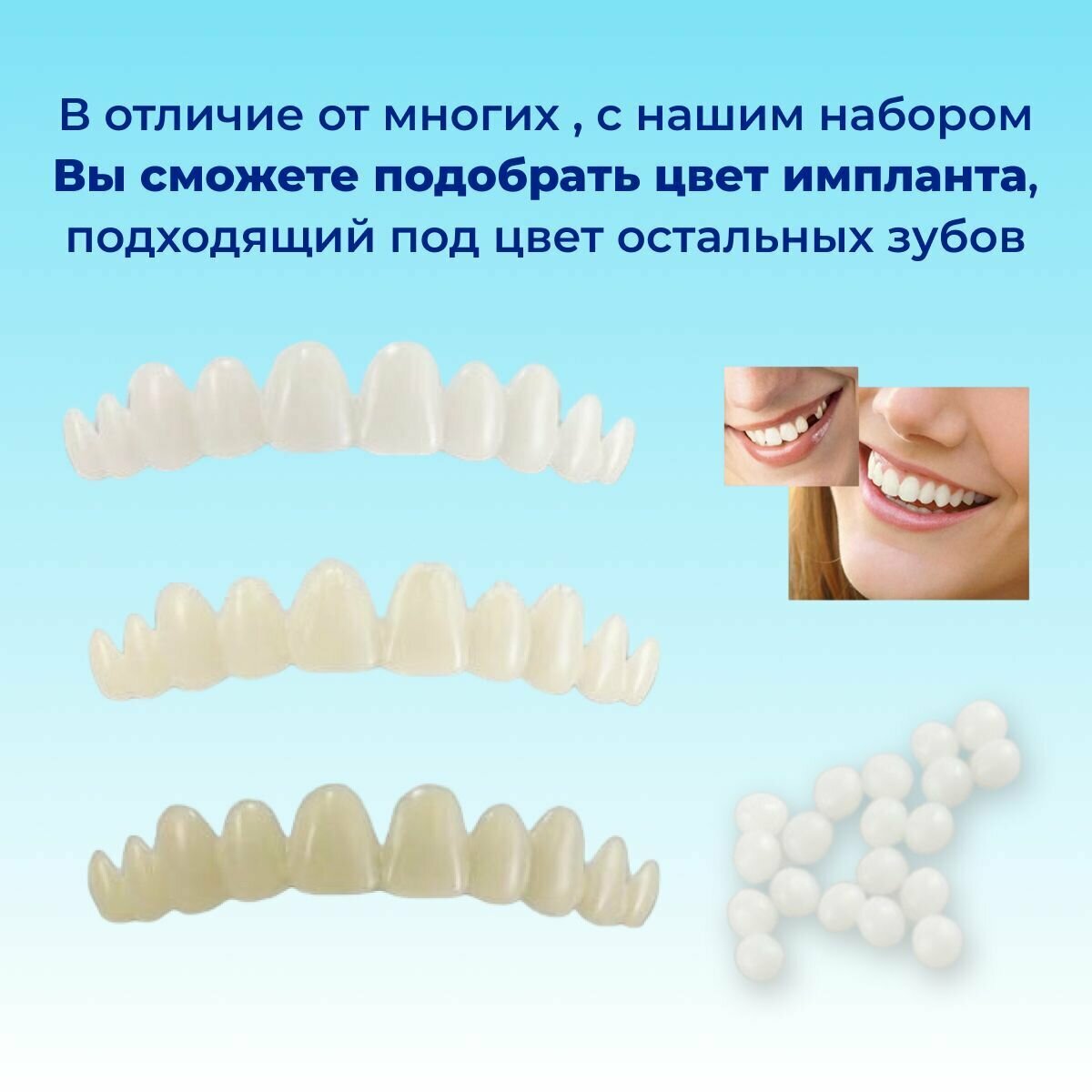Отзывы на Пломбировочный временный материал. Пломба немедицинская для самостоятельной установки с тремя комплектами зубов разной белизны.