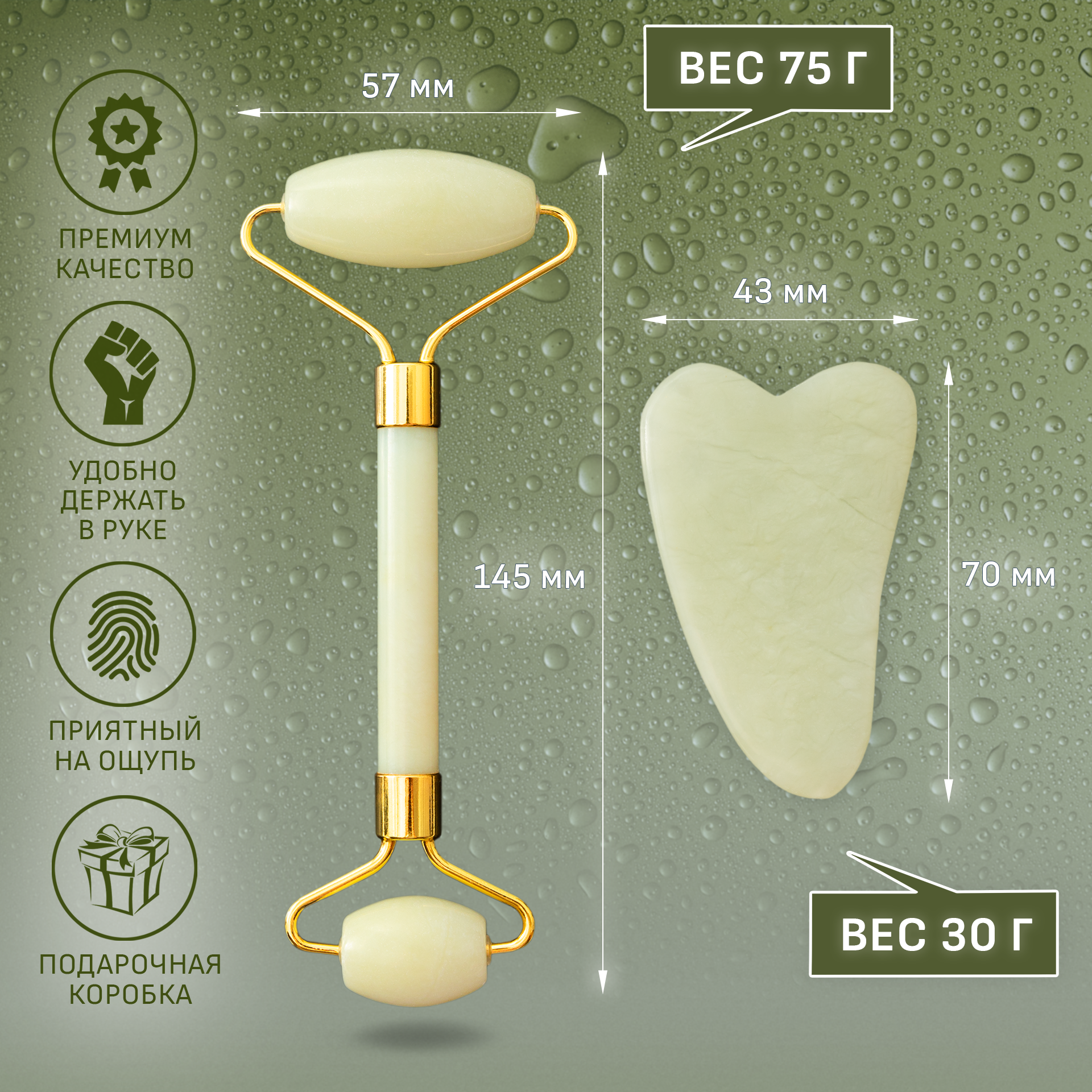 10 цен на Ролик и скребок гуаша массажные из светло-зеленого нефрита (набор). Роллер и скребок нефритовые для массажа лица и тела. Подарок девушке на День влюбленных и 8 Марта
