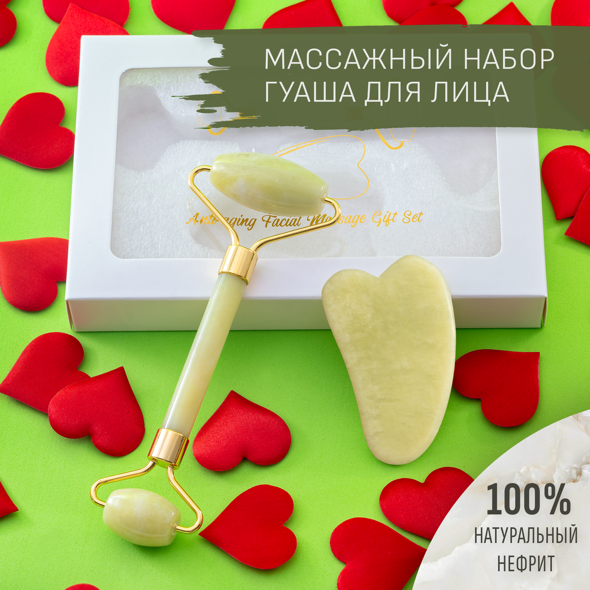 10 цен на Ролик и скребок гуаша массажные из лимонного нефрита (набор). Роллер и скребок нефритовые для массажа лица и тела. Подарок девушке на День влюбленных и 8 Марта