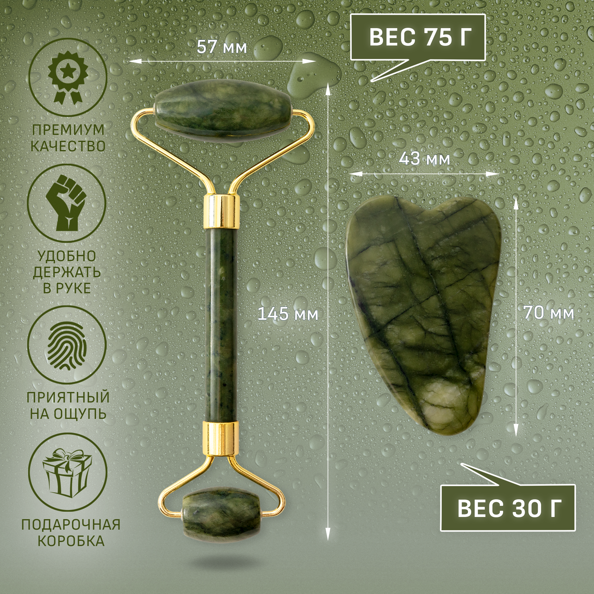 Отзывы на Ролик и скребок гуаша массажные из темно-зеленого нефрита (набор). Роллер и скребок нефритовые для массажа лица и тела. Подарок девушке на День влюбленных и 8 Марта