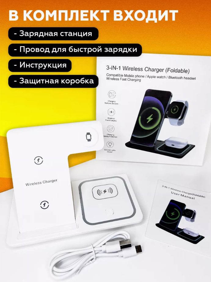 10 цен на Док станция для беспроводной зарядки 3 в 1 для телефонов IPhone, Samsung, Xiaomi, а также часов и наушников Apple. Цвет Белый