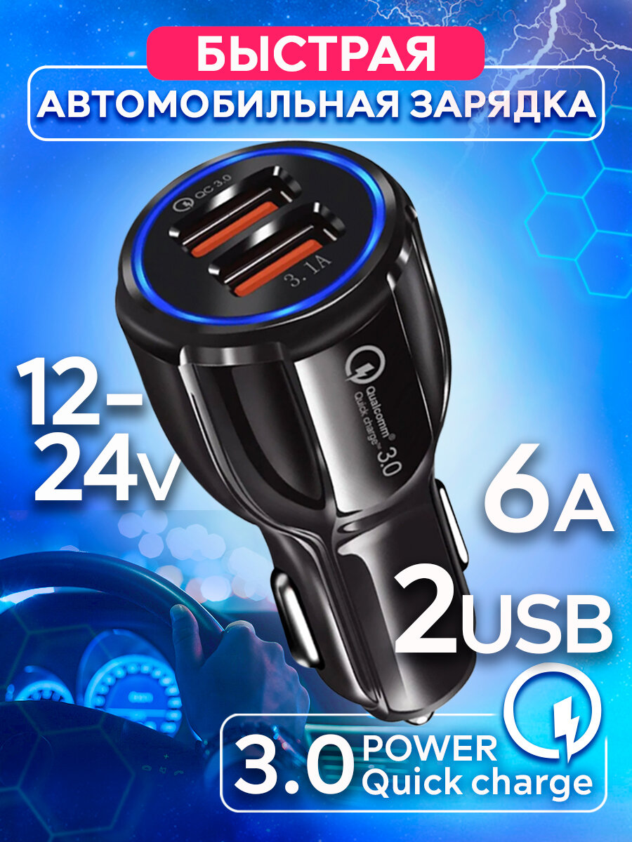 Отзывы на Автомобильное зарядное устройство в прикуриватель 2USB х 3.1А с кабелем Type-C 1м, быстрая зарядка, аптер питания
