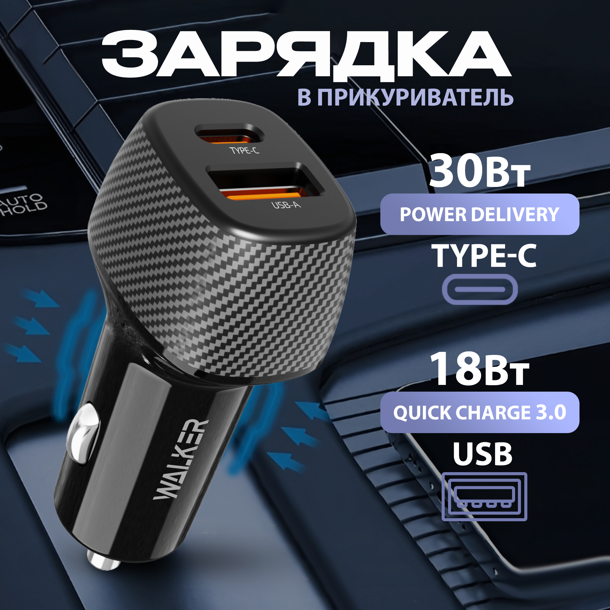 Автомобильная зарядка в прикуриватель, WCR-35, WALKER, 48Вт, USB/Type-C, аксессуары в салон для машины, зарядное устройство для авто на айфон, черный 668 ₽