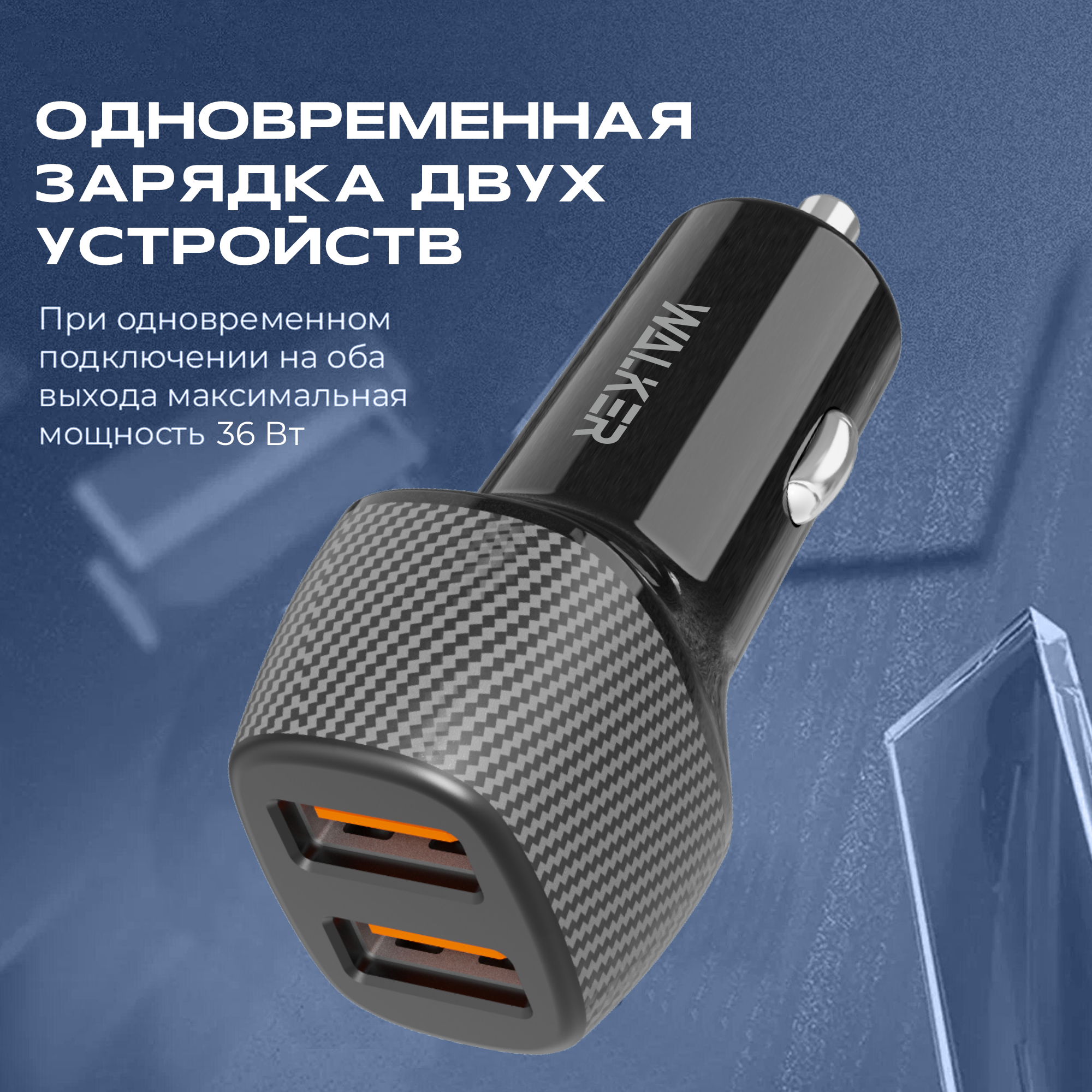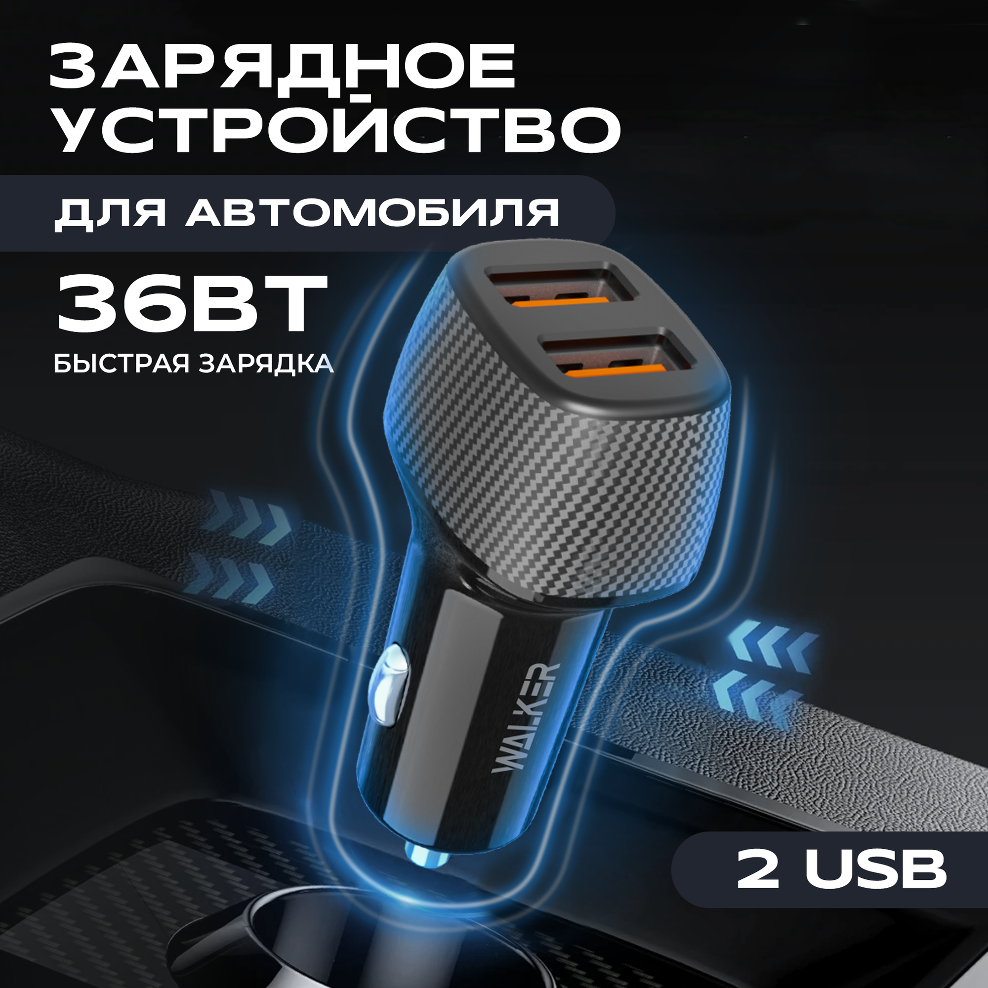 Зарядка в прикуриватель, WALKER, WCR-33, 36Вт, USBx2, быстрая зарядка QC3.0, зарядка для телефона, зарядное устройство, зарядка для айфона, черный информация: