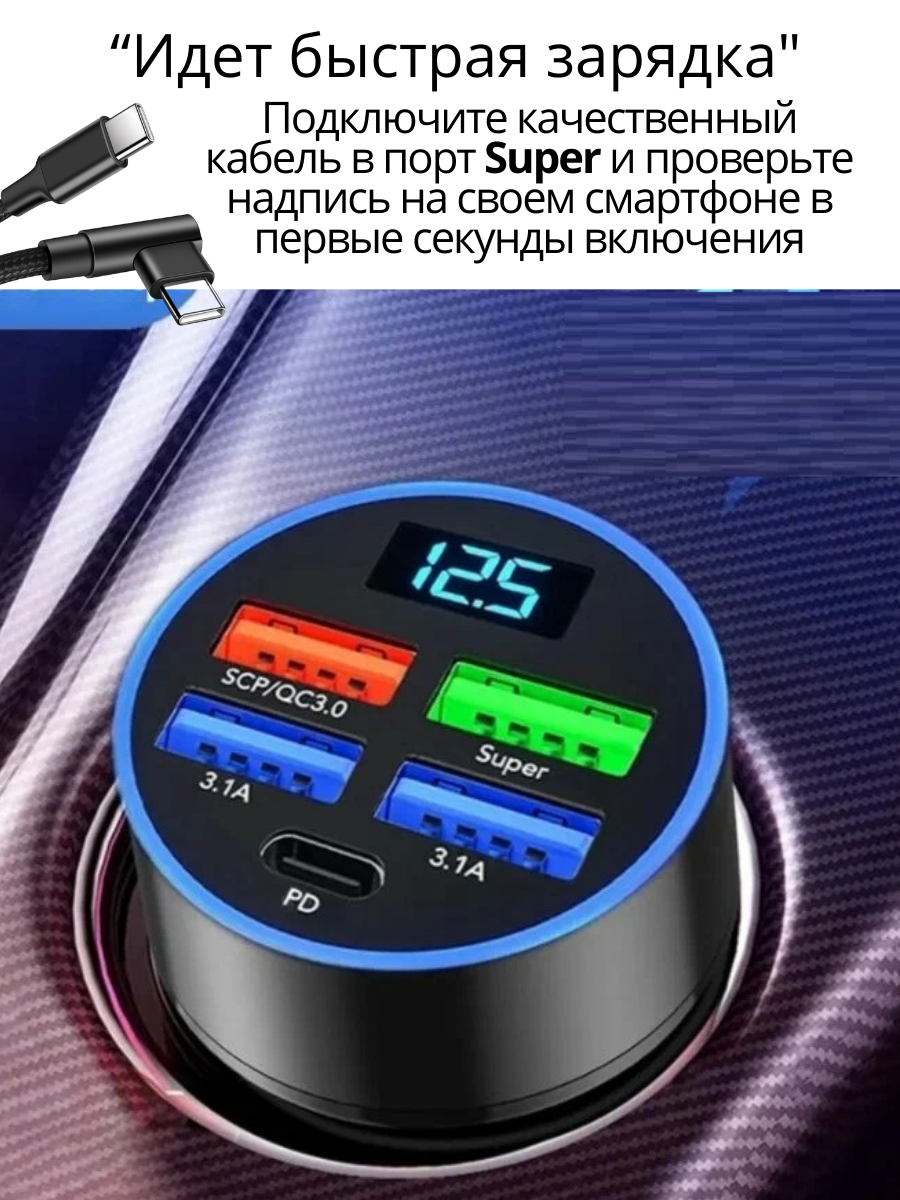 Автомобильная зарядка быстрая USB_Super+3.1A+PD с вольтметром 625 ₽