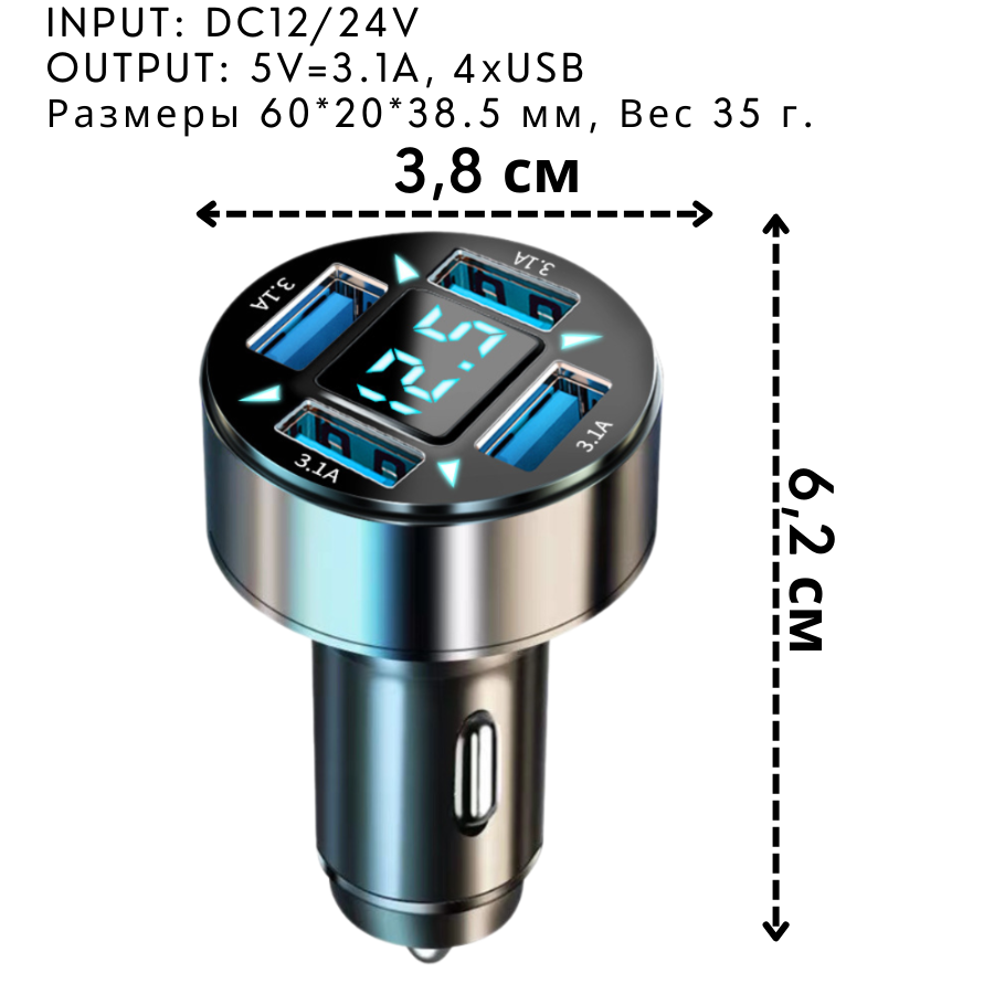 Автомобильная зарядка 3.1А 4хUSB с вольтметром для телефона в прикуриватель информация: