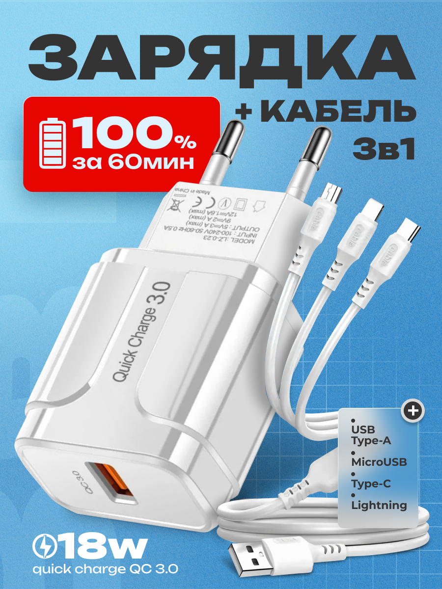 Быстрая зарядка для всех мобильных устройств с кабелем 3-в-1! (белый) информация: