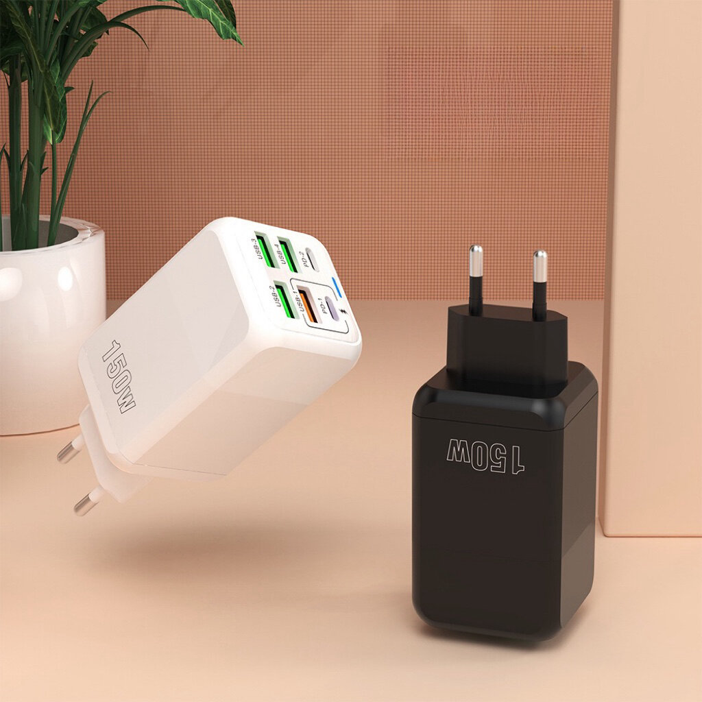 Зарядное устройство (адаптер) для зарядки телефона, планшета. 4 USB порта и 2 Type-C разъема. 150W 5V / цвет черный информация:
