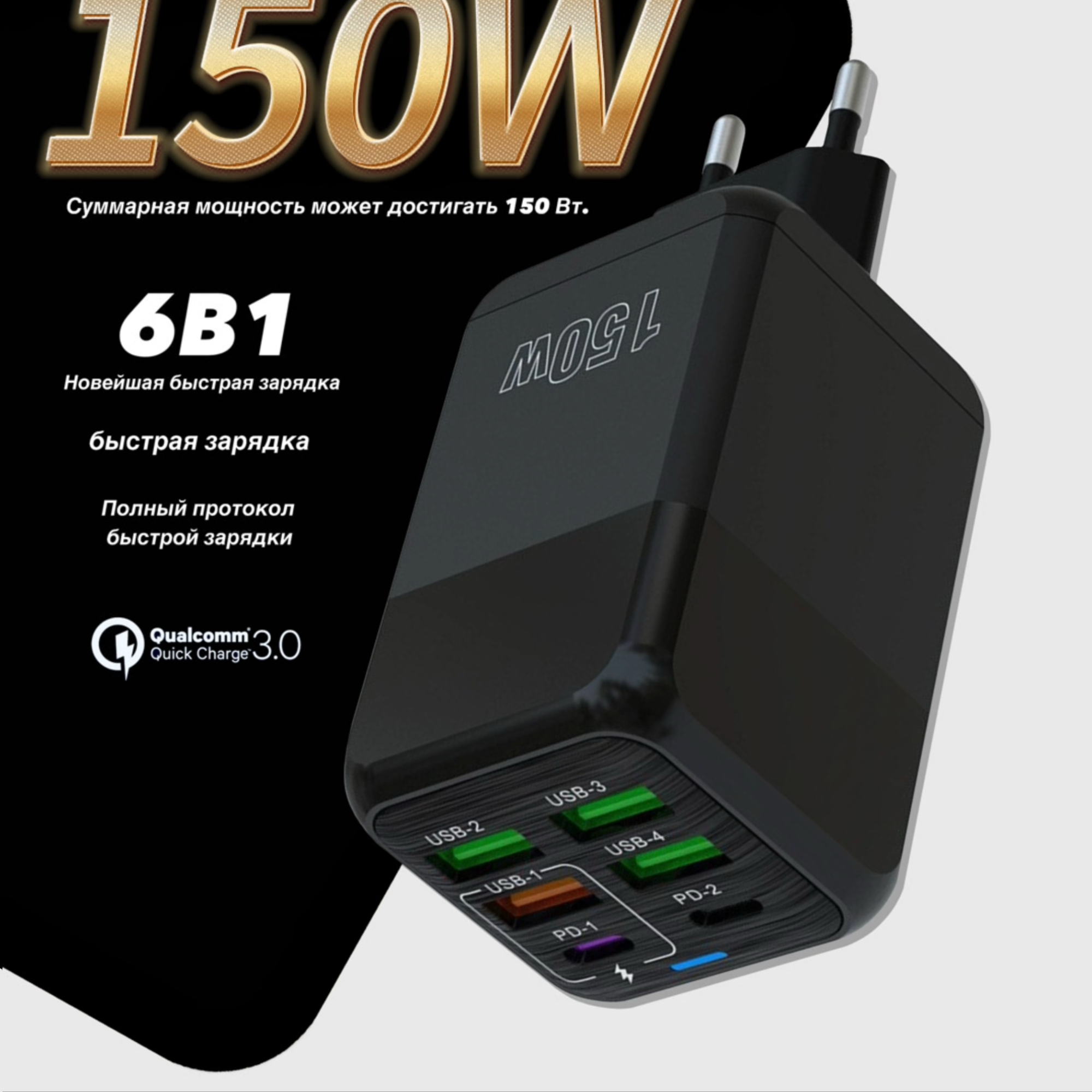 Отзывы на Зарядное устройство (адаптер) для зарядки телефона, планшета. 4 USB порта и 2 Type-C разъема. 150W 5V / цвет черный