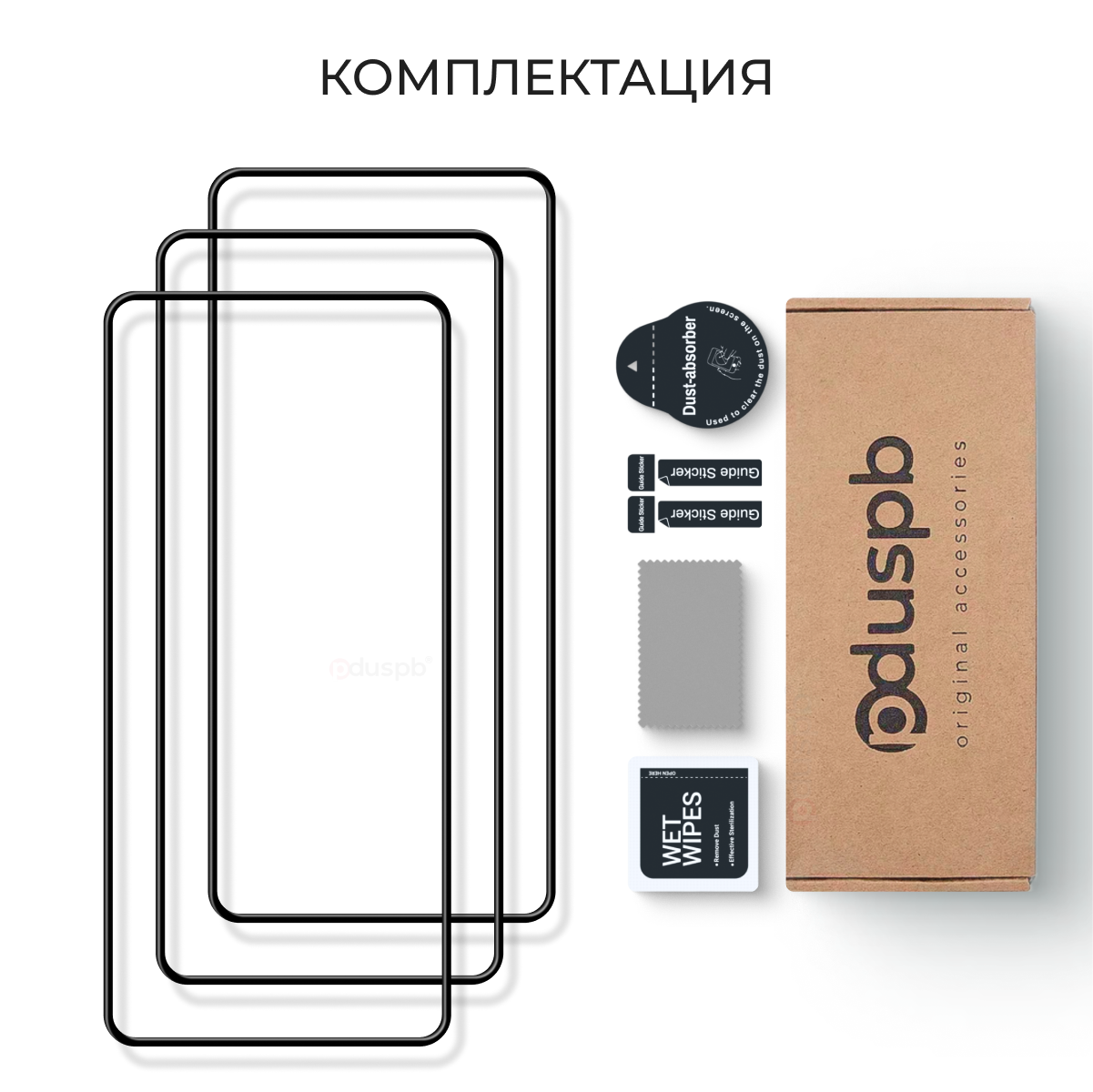 | Подробная комплектация | Комплектация: Надежная упаковка, защитное стекло, сухая салфетка из микрофибры, влажная салфетка для обезжиривания, стикеры для удаления пыли |